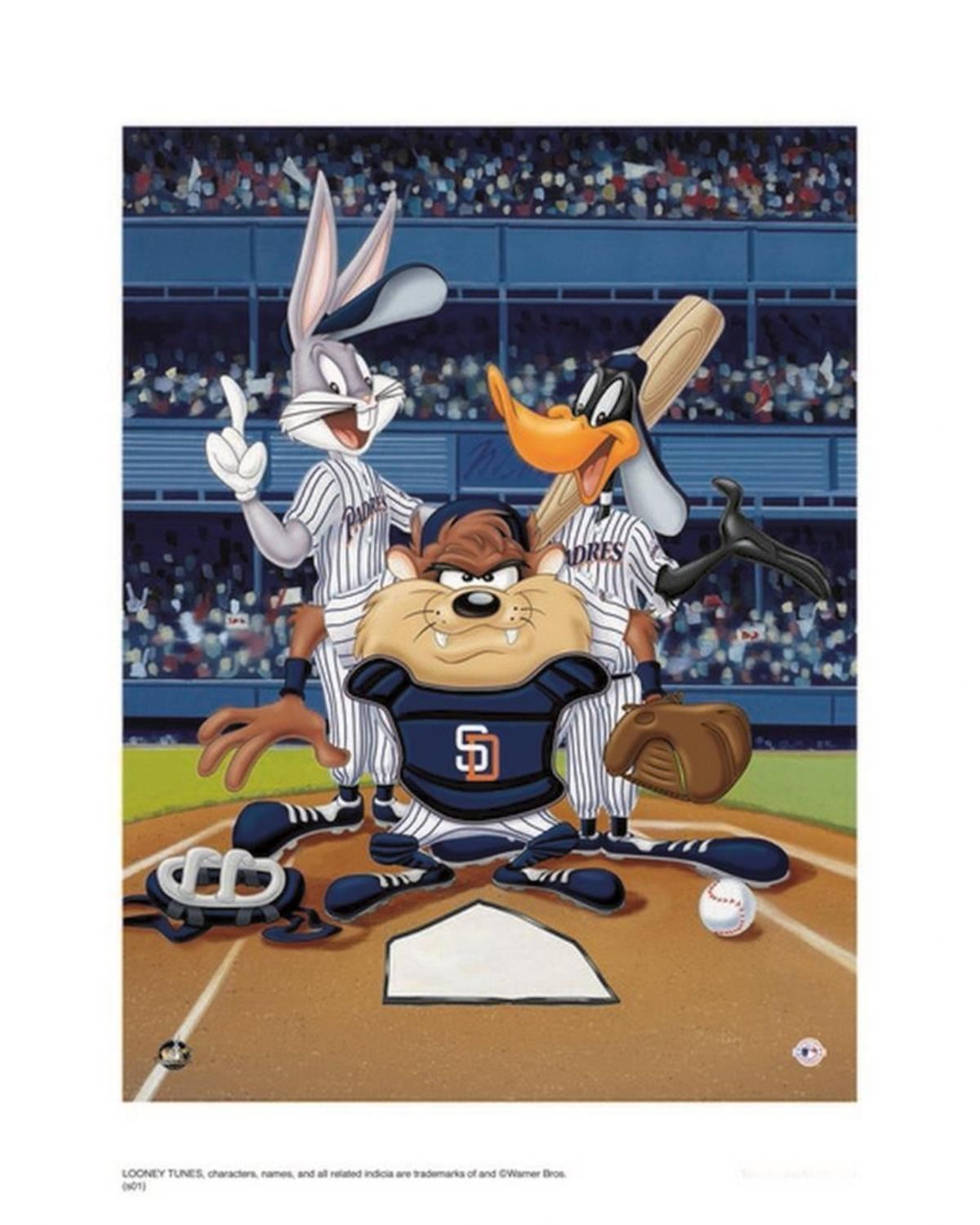 Artist: Warner Brothers - Title: At the Plate Padres - Medium: Giclee on Fine Art Paper - Limited Edition: 500 - Image Size: Approximately 16 Inches x 12 inches - Paper Size: Approximately 16 inches x 20 inches - Framed: Unframed - Details: This work comes with a Warner Brothers Hologram for Authenticity - The three Warner Directors were expected to turn out ten six-minute cartoons each year, or one every five weeks! And, each director had his own lead designer, background artist, and a team of animators. Mel Blanc provided the common thread as the man of a thousand voices, and Carl Stalling is most recognized as the Music Director for the majority of the Warner Bros. shorts