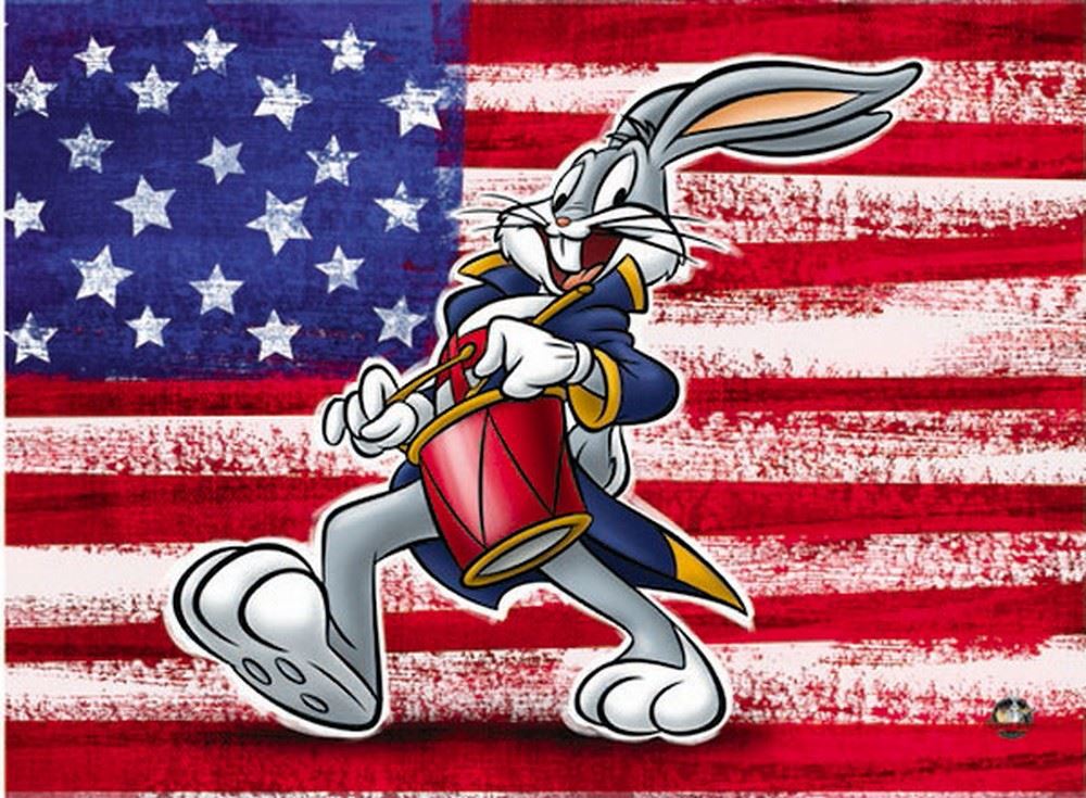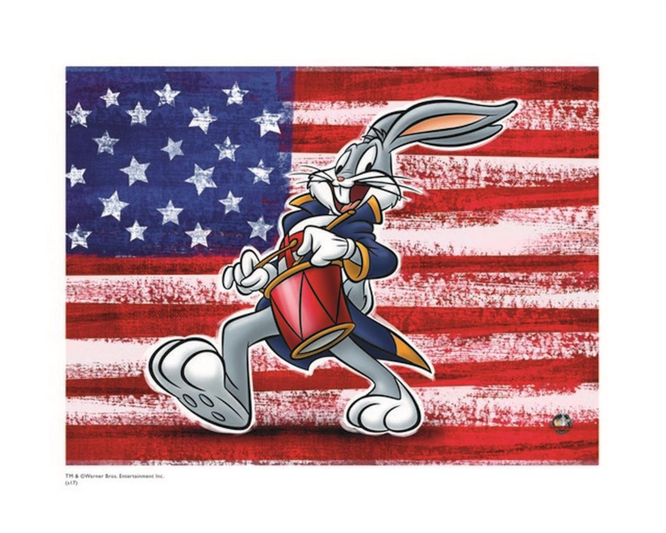 Artist: Warner Brothers - Title: Bugs with Flag - Medium: Giclee on Fine Art Paper - Limited Edition: 500 - Image Size: Approximately 12 Inches x 16 inches - Paper Size: Approximately 16 inches x 20 inches - Framed: Unframed - Details: This work comes with a Warner Brothers Hologram for Authenticity - The three Warner Directors were expected to turn out ten six-minute cartoons each year, or one every five weeks! And, each director had his own lead designer, background artist, and a team of animators. Mel Blanc provided the common thread as the man of a thousand voices, and Carl Stalling is most recognized as the Music Director for the majority of the Warner Bros. shorts