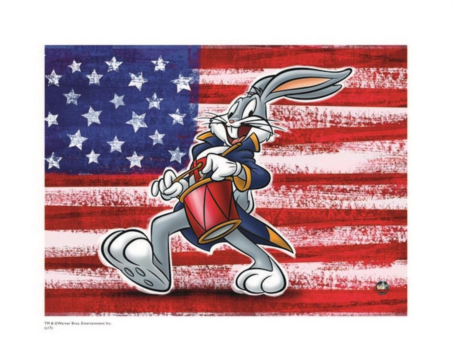 Artist: Warner Brothers - Title: Bugs with Flag - Medium: Giclee on Fine Art Paper - Limited Edition: 500 - Image Size: Approximately 12 Inches x 16 inches - Paper Size: Approximately 16 inches x 20 inches - Framed: Unframed - Details: This work comes with a Warner Brothers Hologram for Authenticity - The three Warner Directors were expected to turn out ten six-minute cartoons each year, or one every five weeks! And, each director had his own lead designer, background artist, and a team of animators. Mel Blanc provided the common thread as the man of a thousand voices, and Carl Stalling is most recognized as the Music Director for the majority of the Warner Bros. shorts