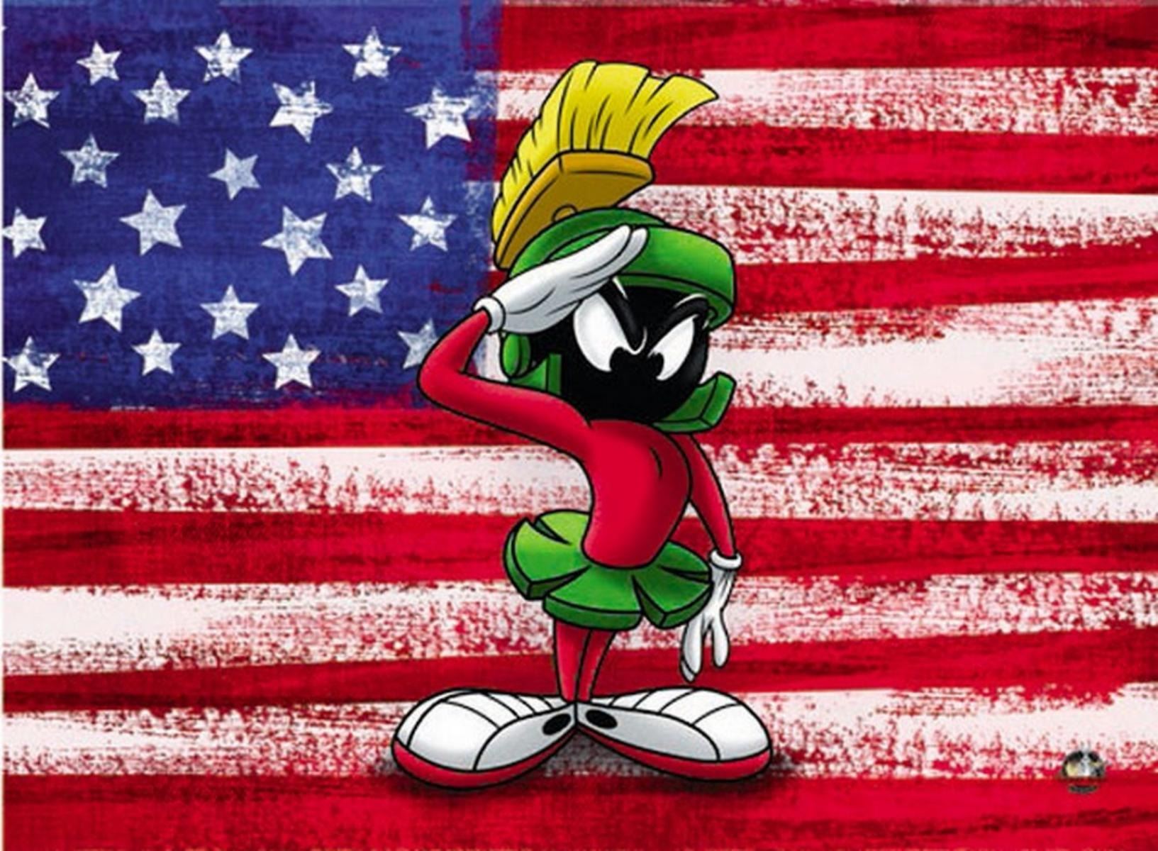 Artist: Warner Brothers - Title: Marvin with Flag - Medium: Giclee on Fine Art Paper - Limited Edition: 500 - Image Size: Approximately 12 Inches x 16 inches - Paper Size: Approximately 16 inches x 20 inches - Framed: Unframed - Details: This work comes with a Warner Brothers Hologram for Authenticity - The three Warner Directors were expected to turn out ten six-minute cartoons each year, or one every five weeks! And, each director had his own lead designer, background artist, and a team of animators. Mel Blanc provided the common thread as the man of a thousand voices, and Carl Stalling is most recognized as the Music Director for the majority of the Warner Bros. shorts