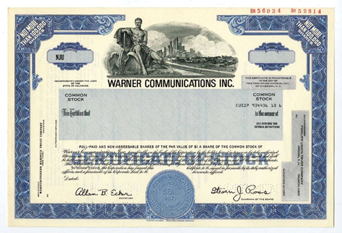 Steven J. Ross facsimile signature on Warner Communications Inc., 1978 <100,000 Shrs Specimen Stock Cert., XF SC-USBN. Common Stock. It was the parent company for Warner Bros. Pictures, Warner Music Group and, though Warner Cable, Dimension Pictures. It also owned DC Comics and Mad magazine. Warner made (and later lost) considerable profits with Atari, Inc., which it owned from 1976 to 1984. In 1979, Warner formed a joint venture with credit card company American Express, Warner-Amex Satellite Entertainment, which owned such cable channels as MTV, Nickelodeon, and The Movie Channel. Warner bought out American Express's half in 1984, and sold the venture a year later to Viacom, which renamed it MTV Networks(now known as Viacom Media Networks). In 1982, Warner purchased Popular Library from CBS Publications. In 1987, it was announced that Warner Communications and Time Inc. were to merge, although it took two years for the merger to take place. The merged company, Time Warner, was acquired by AT&T in 2018 and renamed WarnerMedia. The Warner Communications name was still credited on releases from Elektra Records and its sister labels until 2004. The Warner Music Group continues to use the "Big W" logo, designed by Saul Bass in 1972.