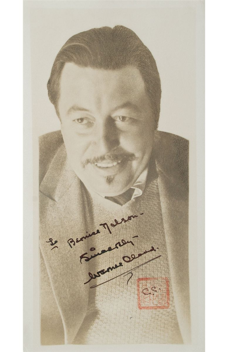 Swedish actor who gained cinema immortality as the famous Hawaiian-Chinese detective, Charlie Chan. Vintage matte-finish 5.25 x 9.75 photo, signed in fountain pen “To Bernice Nelson,Sincerely Warner Oland.”, with a Chinese chop block signature and where he added CC for (Charlie Chan) In fine condition, and rare in this format with double signature.