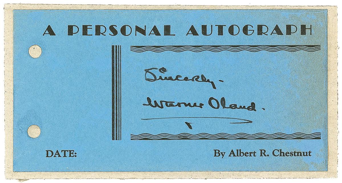 The screen's most prolific Caucasian portrayer of Asian characters, the Swedish actor gained cinema immortality as the famous Hawaiian Chinese detective, Charlie Chan. Vintage fountain pen signature, “Sincerely, Warner Oland,” on a 5.5 x 2.75 blue card from the Albert R. Chestnut collection and attached to a slightly larger gray card. In very good condition, with punch holes to left edge and scattered light toning. Pre-certified PSA/DNA and RRAuction COA.