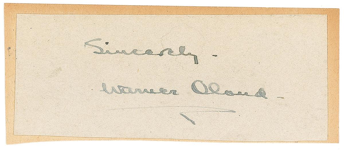 Vintage fountain pen signature, “Sincerely, Warner Oland,” on an off-white 4 x 1.5 slip affixed to a slightly larger card. In fine condition.