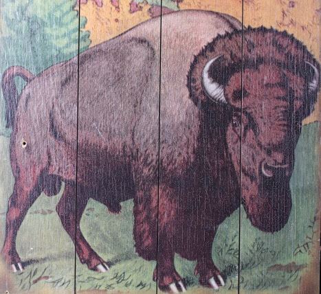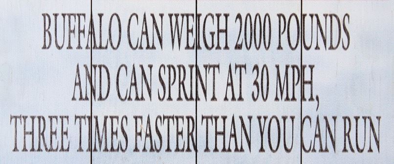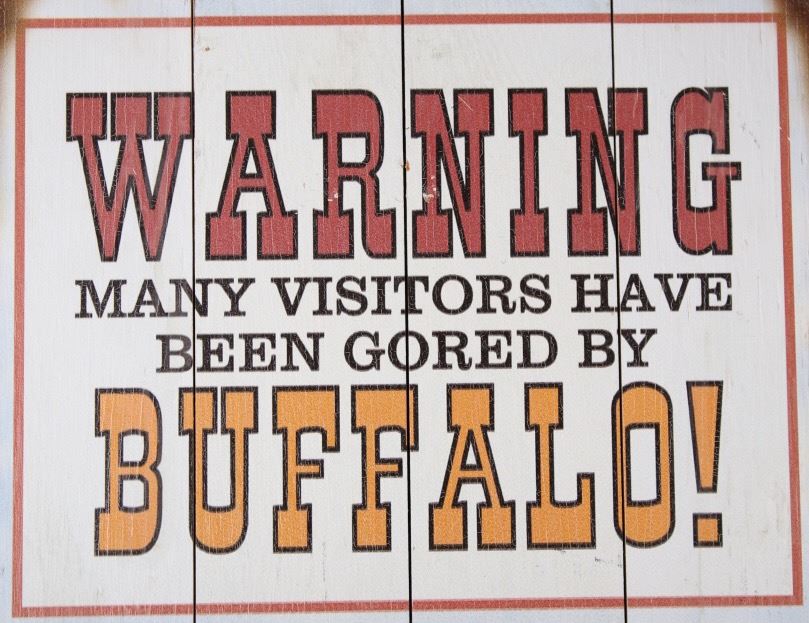 For your bidding pleasure is this Warning Visitors Have Been Gored By Buffalo Sign. This sign is in good condition with little to no wear and tear. The sign has a painted picture of a buffalo set before rolling hills with "Warning many visitors have been gored by buffalo! Buffalo can weigh 2000 pounds and can sprint at 30 MPH three times faster than you can run; Rocky Mountain National Park" written on it in different colors. This sign measures 35 3/4" x 14".