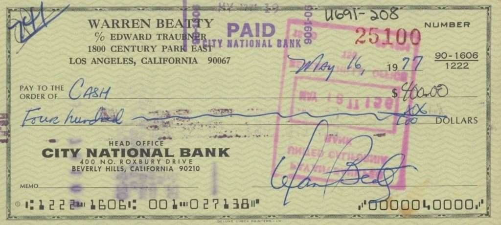 Warren Beatty double signed signed check dated May 16, 1977. CUT116