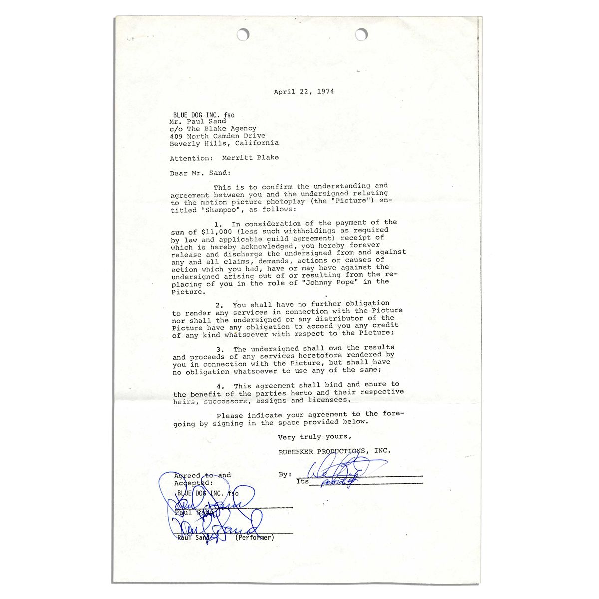 Warren Beatty signed contract for his Oscar winning movie ''Shampoo.'' Beatty starred in and produced the 1970's drama through his company Rubeeker Productions and signs here as its President. Contract is for actor Paul Sand who was replaced in the role of ''Johnny Pope.'' 1pp. signed in blue ink, dated 22 April 1974. Measures 8.5'' x 13'' with two hole punches at top. Near fine.