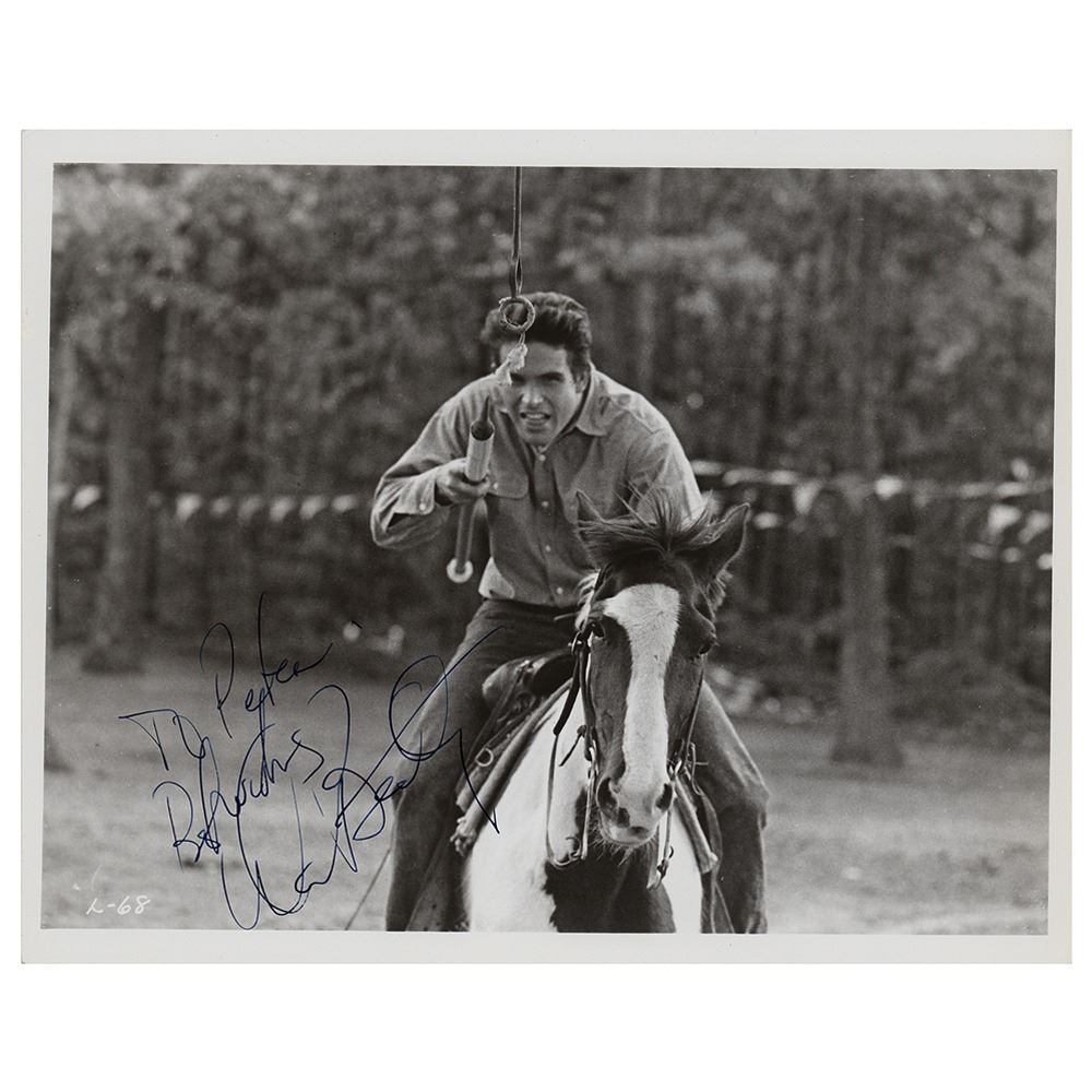 Glossy 10 x 8 photo of Beatty on horseback in the jousting scene from the 1964 film Lilith, signed and inscribed in fountain pen, "To Peter, Best wishes, Warren Beatty.” In fine condition.