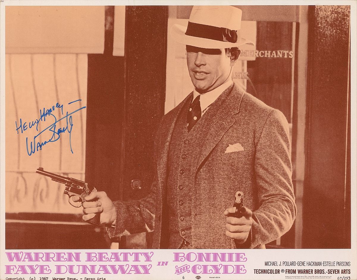 Appealing color lobby card for the 1967 Warner Brothers film Bonnie and Clyde, 14 x 11, signed and inscribed in blue felt tip, “Hello Harvey—Warren Beatty.” In fine condition, with a light paperclip impression along the top edge.