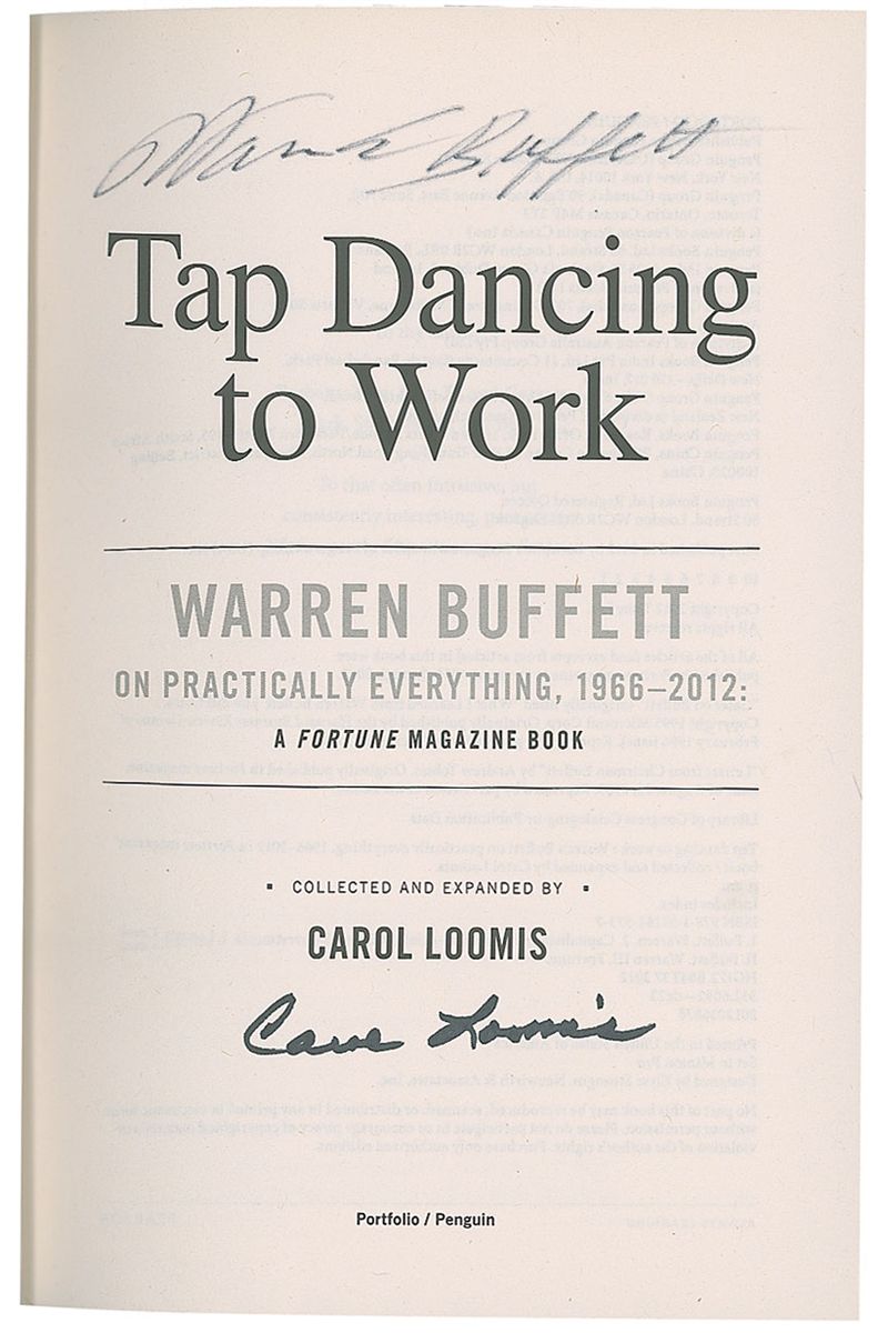 Signed book: Tap Dancing to Work. First edition, first printing. NY: Penguin, 2012. Hardcover with dust jacket, 6.25 x 9.25, 345 pages. Signed on the title page in black felt tip by Buffett and also signed by Carol Loomis. In fine condition, with Buffett’s signature just a shade light. Accompanied by a laminated May 4, 2013, Berkshire Hathaway shareholder’s meeting pass where Buffett signed 500 books.