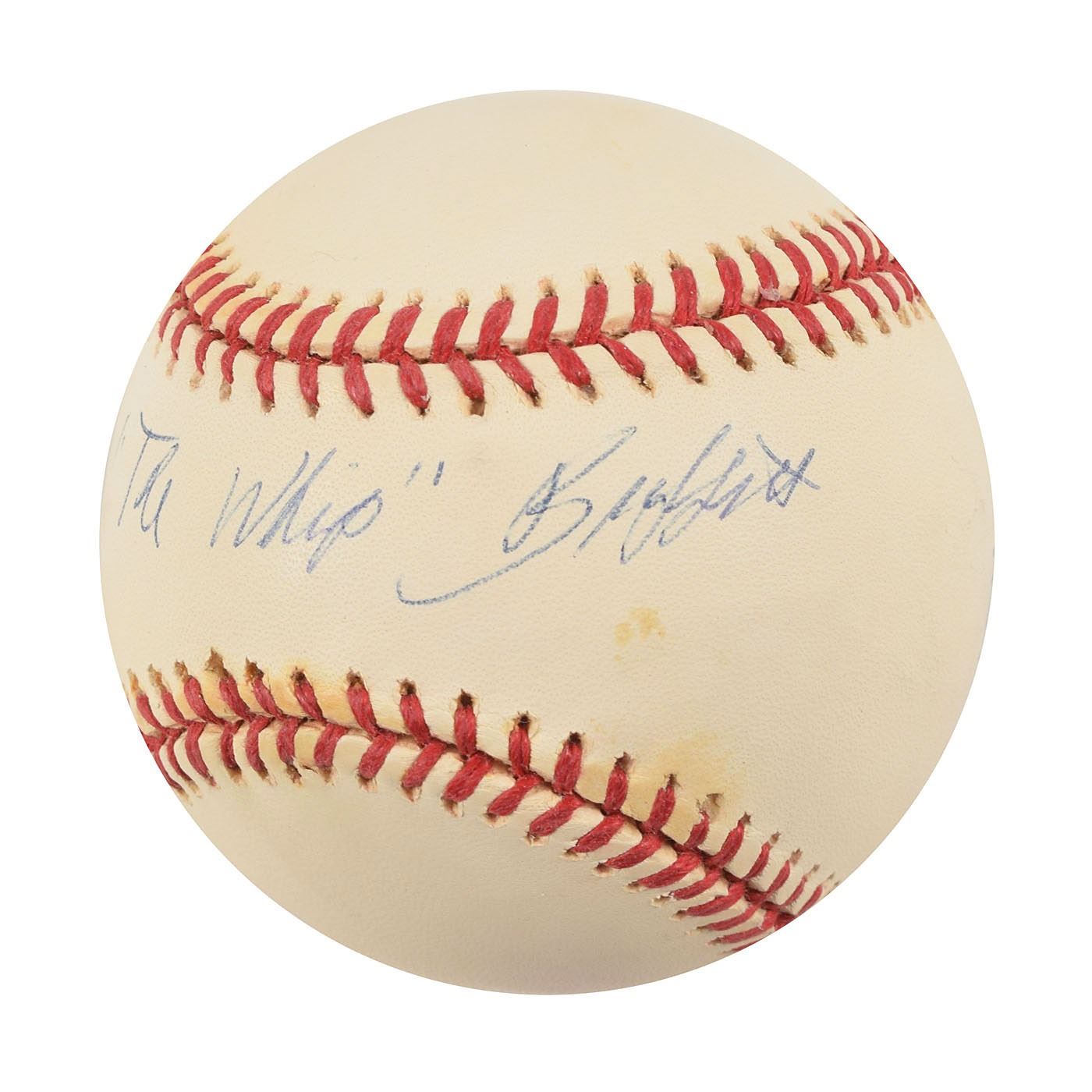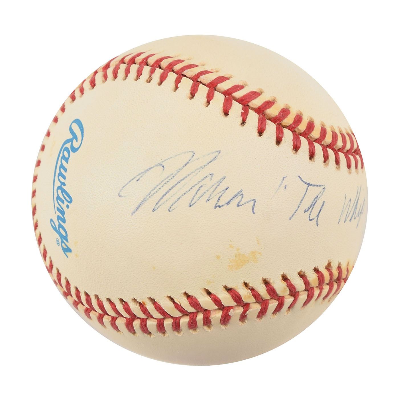 Official Rawlings American League (Budig) baseball signed in black ballpoint on the sweet spot, "Warren 'The Whip' Buffett." In fine condition. Originally obtained by in-person specialist Mike Wehrmann, who notes that it was signed on October 21, 2002, at the Fraunces Tavern in New York at a press event for the animated series Liberty's Kids. An avid baseball fan and former partial owner of the AAA minor league team the Omaha Chasers, Buffett adopted the nickname 'The Whip' for his pitching prowess.