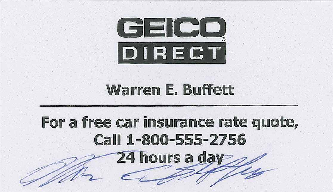 Souvenir Geico Direct business card printed with Buffett's name and a toll free number, 3.5 x 2, signed in blue ballpoint, "Warren E. Buffett." In very fine condition.