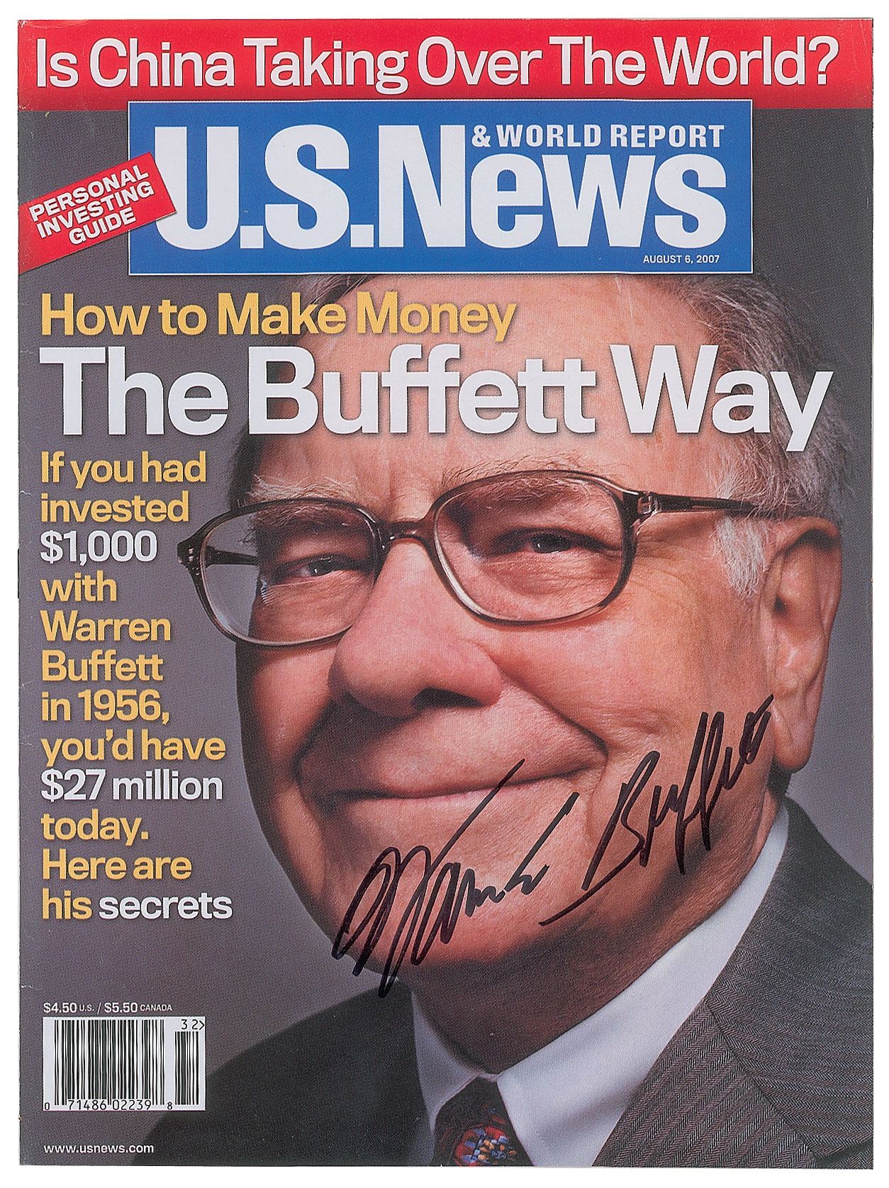U.S. News & World Report magazine from August 6, 2007, with cover featuring a large image of Warren Buffett and the headline, "How to Make Money the Buffett Way," 64 pages, 7.75 x 10.5, signed in black felt tip. In fine condition.