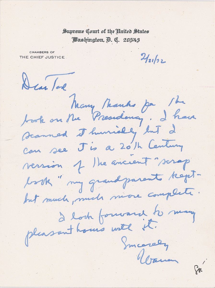 ALS signed “Warren,” one page, 5.75 x 7.75, Supreme Court of the United States letterhead, February 21, 1972. Letter to Vice President Spiro T. Agnew. In part: “Many thanks for the book on the Presidency. I have scanned it hurriedly but I can see it is a 20th Century version of the ancient ‘scrap book’ my grandparents kept—but much, much more complete.” In fine condition. Originates from the personal estate of Spiro Agnew.
