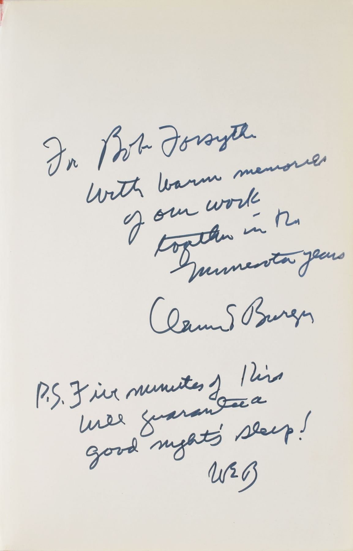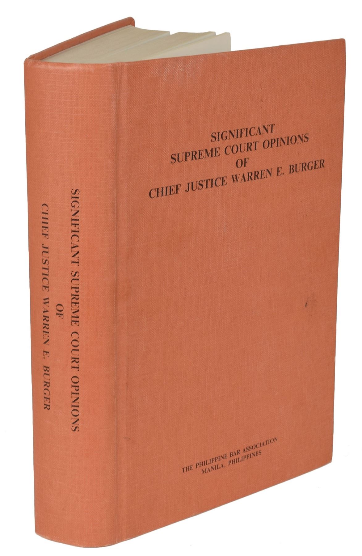 Signed book: Significant Supreme Court Opinions of Chief Justice Warren E. Burger. Manila, Philippines: The Philippine Bar Association, 1984. Hardcover, 6.5 x 9.25, 875 pages. Signed and inscribed on the first free end page in black felt tip, "For Bob Forsythe, with warm memories of our work together in the Minnesota years, Warren E. Burger," who adds his initials at the end of a brief postscript, "Five minutes of this will guarantee a good night's sleep! WEB." In fine condition.