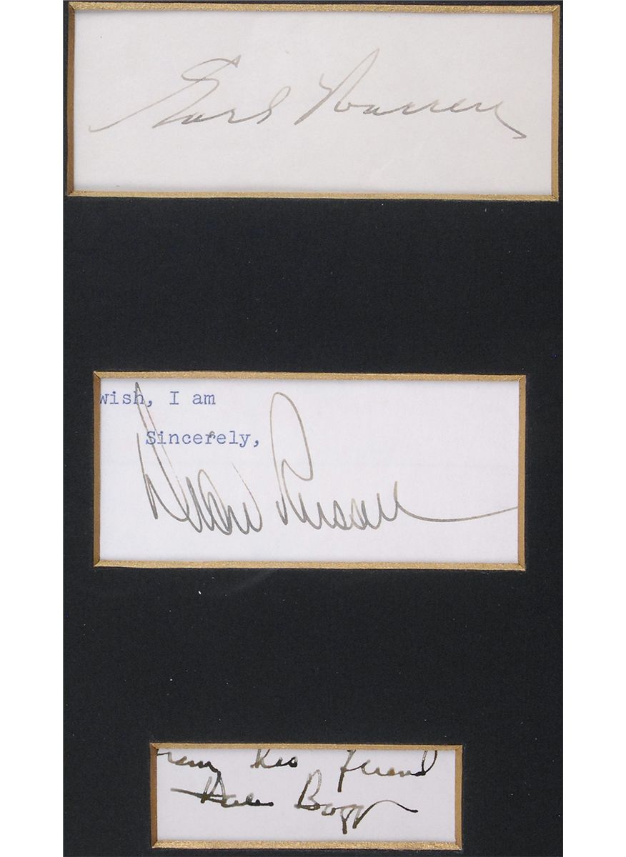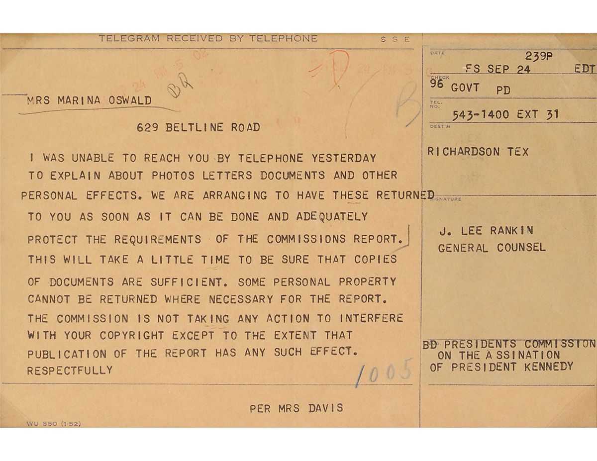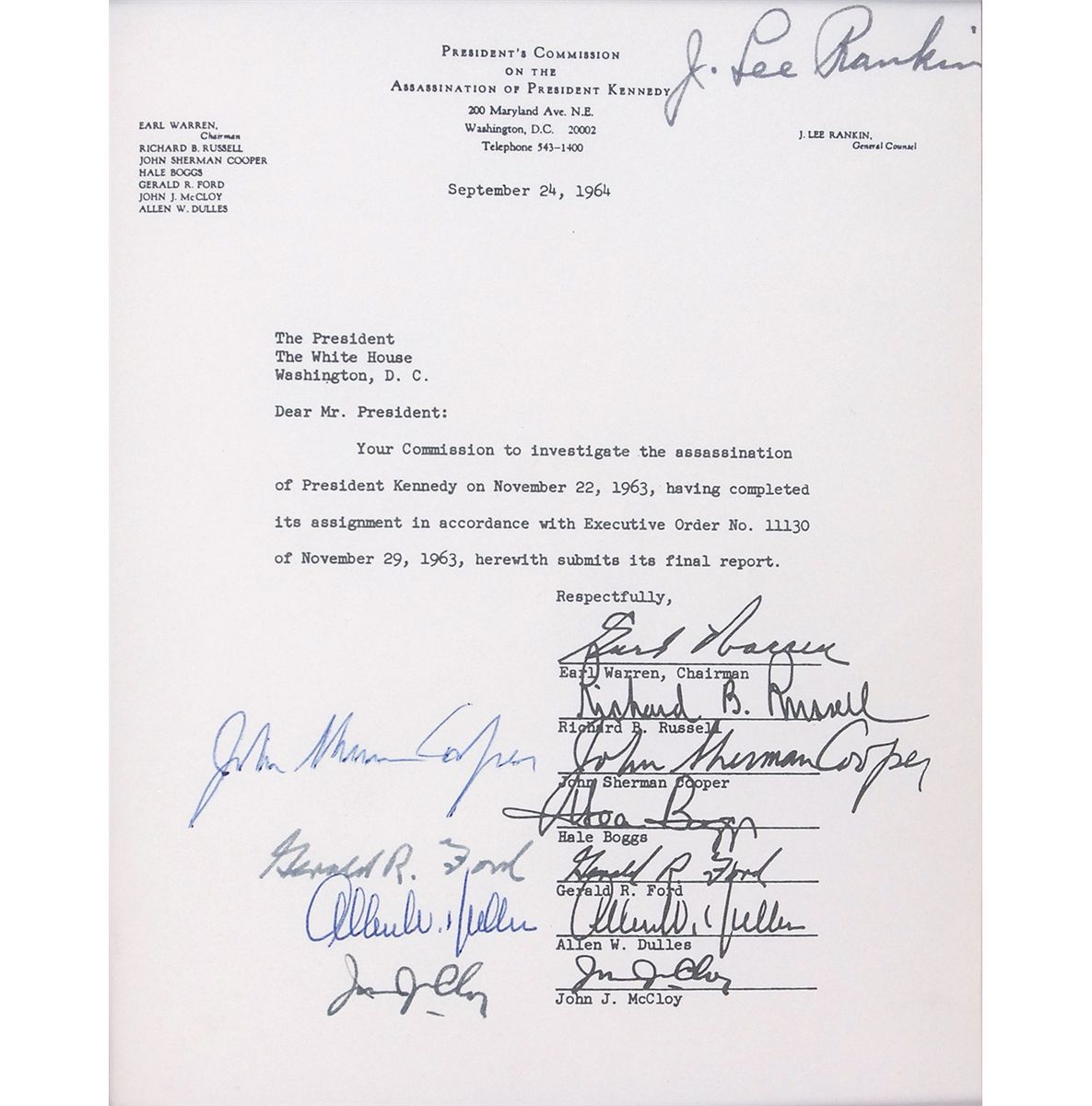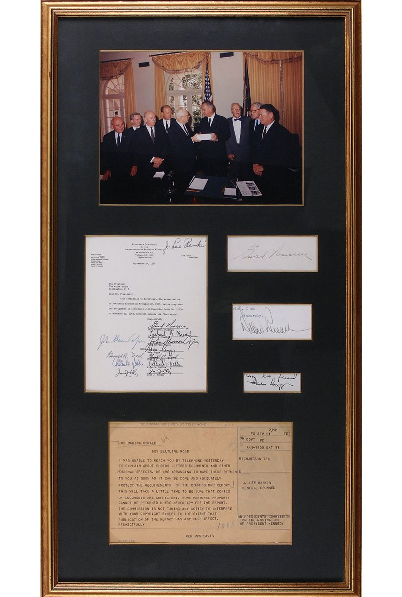 Five items: a presentation letter removed from Warren Commission report, 5.5 x 7, dated September 24, 1964, submitting their report to Lyndon B. Johnson, and bearing printed signatures of all the commission members, signed in ink and ballpoint by John Sherman Cooper, Gerald R. Ford, Allen W. Dulles, John J. McCloy, and J. Lee Rankin; individual ink signatures of Earl Warren, Richard Russell, and Hale Boggs on individual slips; and an original telegram, sent to Marina Oswald on the day of release of the Warren Report, September 24, 1964, from J. Lee Rankin, General Counsel, President’s Commission on the Assassination of President Kennedy. Telegram reads, in part: “I was unable to reach you…to explain about photos, letters, documents, and other personal effects. We are arranging to have these returned to you as soon as it can be done and adequately protect the requirements of the commission’s reports…Some personal property cannot be returned where necessary for the report.” All five items are matted and framed together with a color portrait of the commission presenting its report to President Johnson, to an overall size of 14.75 x 27.5. In fine condition. Despite the promises of Rankin on behalf of the commission, none of Lee Harvey Oswald’s personal items were returned to Marina, with the exception of her husband’s wedding band almost 50 years later.
