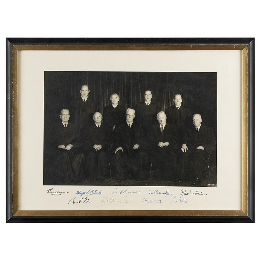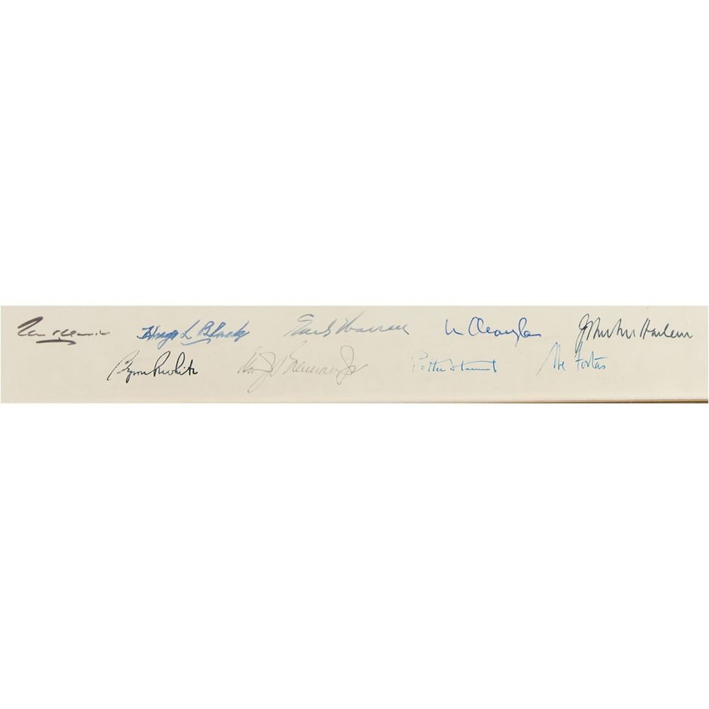 Official matte-finish 16.5 x 11.75 photo of the Warren Court by the Ackad studio of Washington, D.C, signed in the lower border in various ink types by all nine Justices pictured: Earl Warren, Abe Fortas, Potter Stewart, Byron R. White, Tom C. Clark, John Harlan, Hugo Black, William O. Douglas, and William J. Brennan, Jr. Framed and in fine condition.
