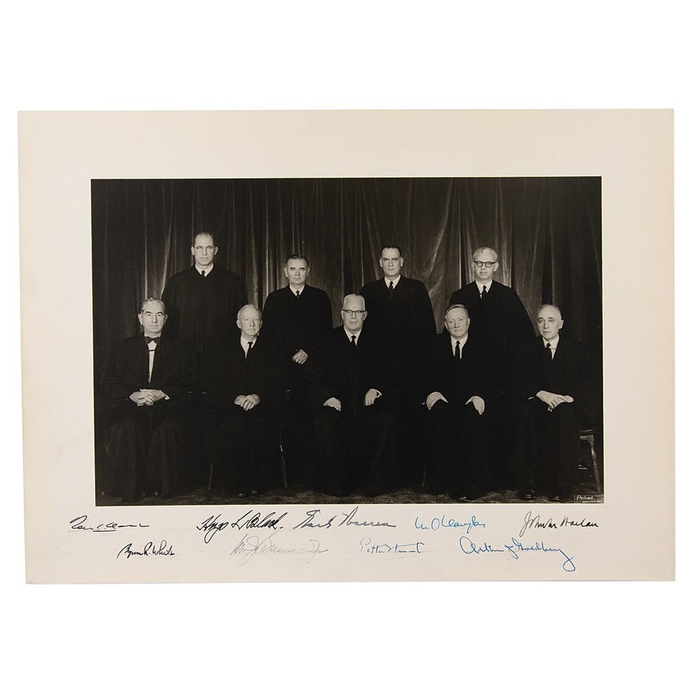Vintage matte-finish 16.5 x 12 photo of the Warren Court in their judicial robes, signed in the lower border in fountain pen by Tom C. Clark, Hugo Black, Earl Warren, William O. Douglas, John M. Harlan II, Byron R. White, William J. Brennan, Jr., Potter Stewart, and Arthur J. Goldberg. Reverse bears an Ackad credit stamp. In fine condition, with a few small surface creases. A desirable oversized, fully signed portrait of the court.