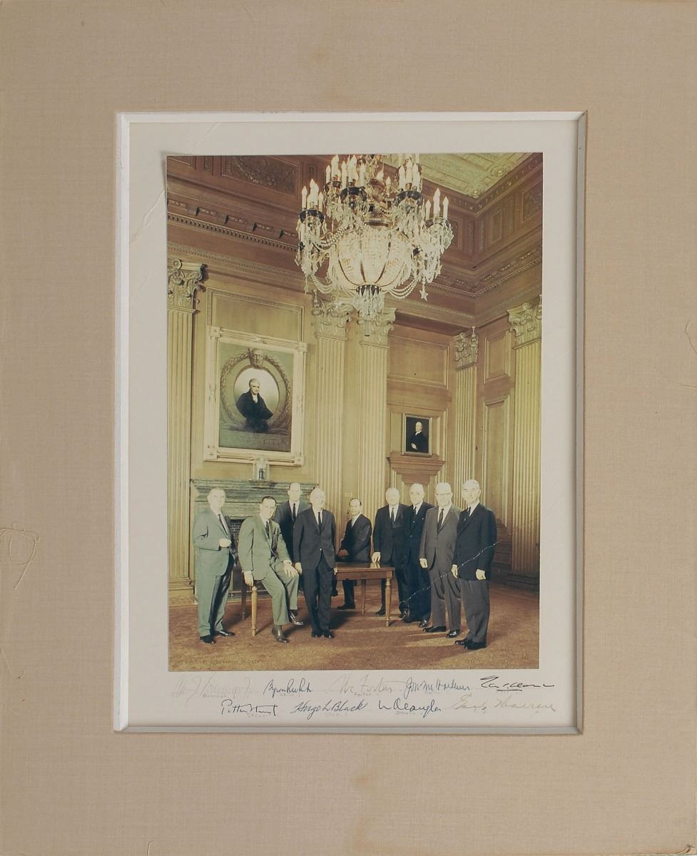 Color satin-finish 8 x 11 photo of the justices inside an impressive section of the Supreme Court, affixed to its original mount, signed on the mount in various inks by all nine justices: Earl Warren; Hugo L. Black; William O. Douglas; Tom C. Clark; Potter Stewart; William J. Brennan, Jr.; John M. Harlan; Byron R. White; and Abe Fortas. Matted to an overall size of 15.5 x 19. In very good condition, with noticeable creases to the upper left of the mount and lower right of the photo, subtle fading to the color image, and a few signatures light but legible (Warren, Brennan, and Fortas are particularly light, while Clark and Stewart are especially bold). This photograph was taken by the National Geographic Society while these nine justice presided over the Court, and is a highly desirable fully signed example, infrequently seen in this large format.