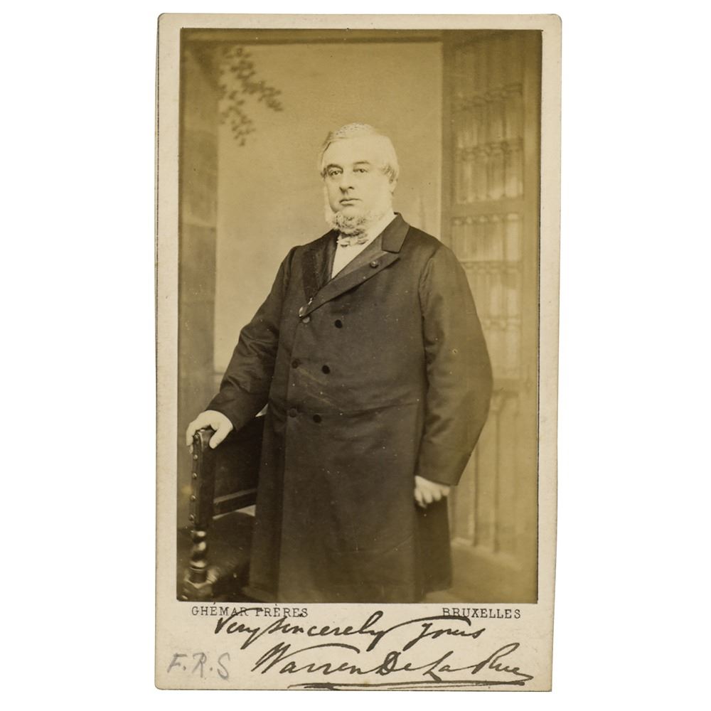 British astronomer, chemist, and inventor (1815–1889) known for his pioneering work in astronomical photography. Scarce 2.5 x 4 carte-de-visite photo of the esteemed astronomer, signed on the mount in ink, "Very sincerely yours, Warren De la Rue." In fine condition.