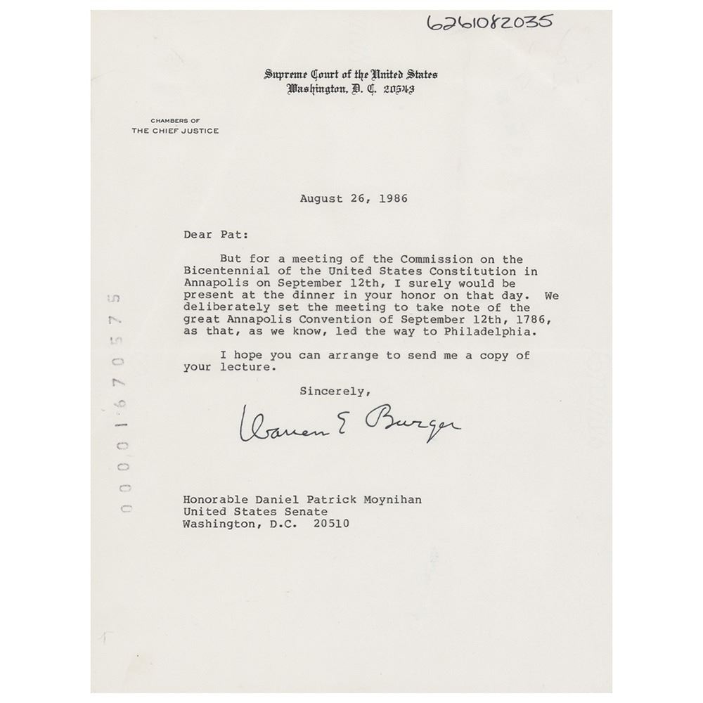TLS, one page, 7.25 x 9.5, Supreme Court of the United States letterhead, August 26, 1986. Letter to Senator Daniel Patrick Moynihan, in part: "But for a meeting of the Commission on the Bicentennial of the United States Constitution in Annapolis on September 12th, I surely would be present at the dinner in your honor on that day. We deliberately set the meeting to take note of the great Annapolis Convention of September 12th, 1776, as that, as we know, led the way to Philadelphia." In fine condition, with some diagonal creasing to upper portion, and a numerical ink notation to the top edge.