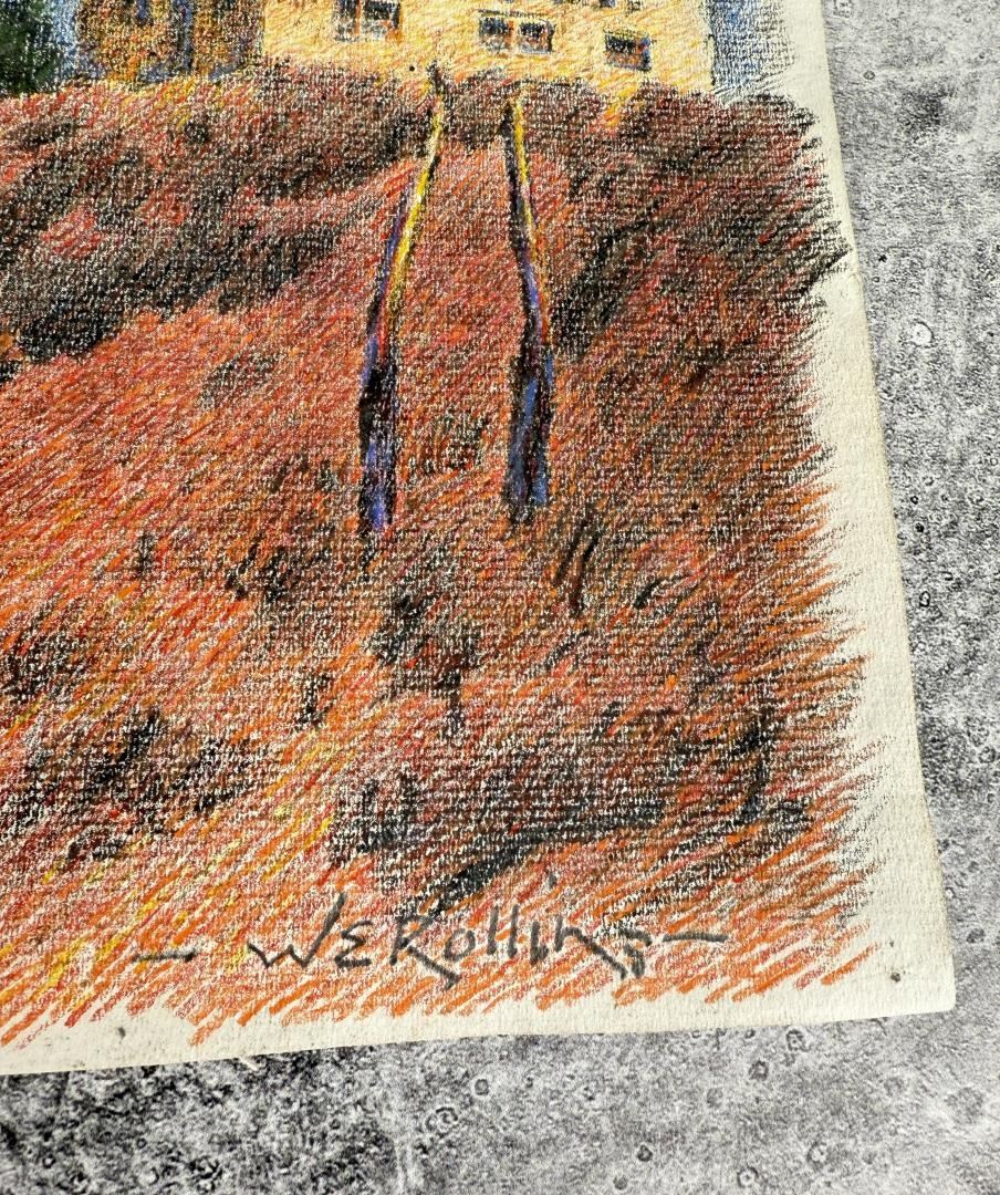 Title is Taos Peublo. Mixed Media on Paper (Crayo-Tone). 10 1/2" by 15 1/2". Provenance: Private Collection Santa Fe New Mexico, John Fillmore Gallery Santa Fe New Mexico. Warren Eliphalet Rollins (1861 - 1962) was active/lived in New Mexico, California, Arizona, Nevada. Warren Rollins is known for Desert landscape and Indian portrait and genre painting. For many years Warren Eliphalet Rollins was known as the "Dean of the Santa Fe art colony." He was the first artist to have a formal exhibition there; it was held in 1906 in the old Palace of the Governors. He was a close friend of Carlos Vierra, Gerald Cassidy, Kenneth Chapman, Sheldon Parsons and most of the other famous artists who assembled in the New Mexican capital during the first half of this century. Born in Carson City, Nevada, Rollins was raised in California and attended the San Francisco School of Design where he studied under Virgil Williams. At the completion of his studies, he was awarded the Avery Gold Medal and made Assistant Director of the school. Following his marriage in 1887, he and his wife settled in San Diego, and it was during this period that Rollins became interested in the Indian as subject matter. In search of material, Rollins, his wife, and their two daughters, Ramona and Ruth, traveled through every Western state from the Mexican to the Canadian borders. While in Montana, Rollins painted a portrait of Calamity Jane. The sitting took place in a saloon, and while Rollins drew, Calamity drank, wept and poured out the story of her life to him. The portrait was lost in a fire at The Billings Club. In the early 1900s, Rollins spent a year in Arizona painting the Hopi, Navajo and Zuni Indians; these studies became very popular. His constant search for new subject matter took him to Taos, where he had a studio near his friend Irving Couse; to Chaco Canyon in northwestern New Mexico, sketching and painting its ancient ruins; and to the Grand Canyon where he had a studio near El Tovar. His dramatic Canyon painting was purchased by the Santa Fe Railroad. Rollins was the first president of the Santa Fe Art Club, and active in the Museum of New Mexico, Santa Fe, which has an extensive collection of his work, including "Grief," one of his most famous paintings. He did murals for the Museum, the post office and Harvey House in Gallup, and triptychs depicting Zuni life for Bishop's Lodge, Santa Fe. His Mayflower Series, done in Crayo-tone, a medium he developed and used almost exclusively in later years, was widely exhibited on the East Coast. Warren E. Rollins continued painting well into his nineties and died at the age of one hundred years and five months in Winslow, Arizona.