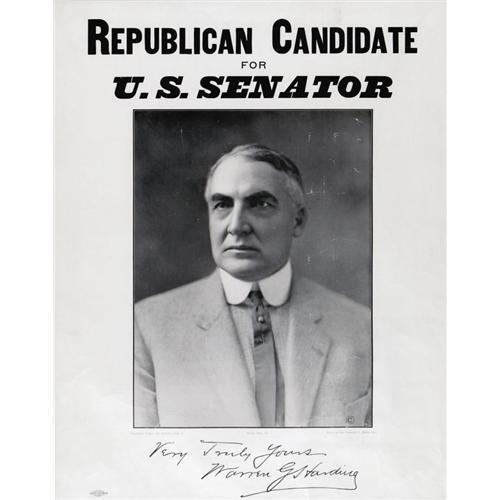 <B>Warren G. Harding: An Early Poster Showing Him As a U.S. Senate Candidate From Ohio.</B></I> Harding rose to prominence after delivering the nominating speech for Taft at the 1912 Republican National Convention. He was elected to the Senate two years later, and of course to the Presidency in 1920. Harding would be the fifth president to die in office three years later, amidst speculation that he had been poisoned by his wife, Florence, as retribution for his notorious philandering. Because they were used in a single state and were most likely to be saved, political items from the early careers of future presidents tend to be rare and highly valued by collectors. This fine poster is no exception. It measures 15.5" x 20", 21" x 25" overall, being nicely matted and custom framed.<BR><BR><b>Shipping:</b> Framed (<a target="_blank" href="http://www.heritageauctions.com/common/shipping.php">view shipping information</a>)