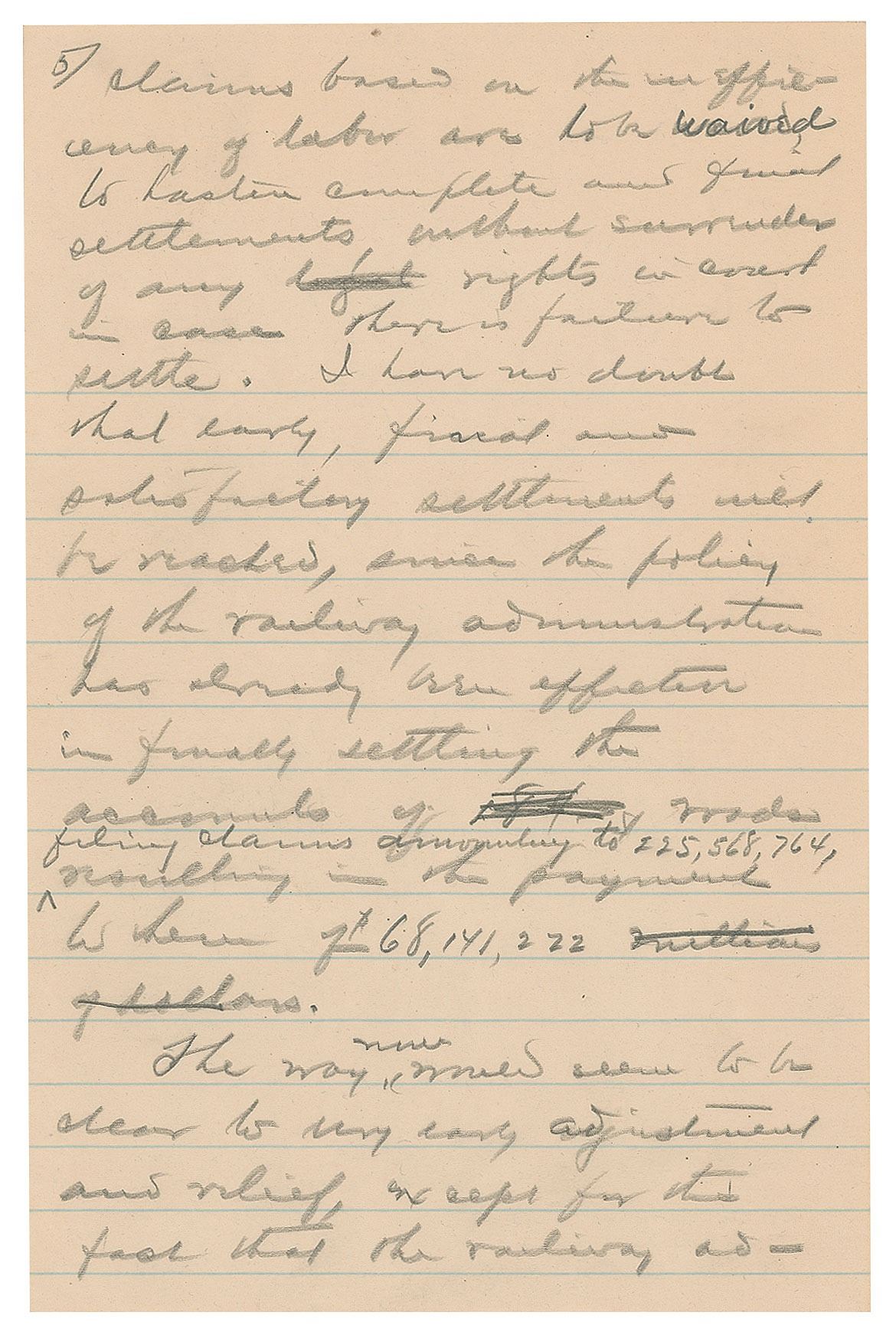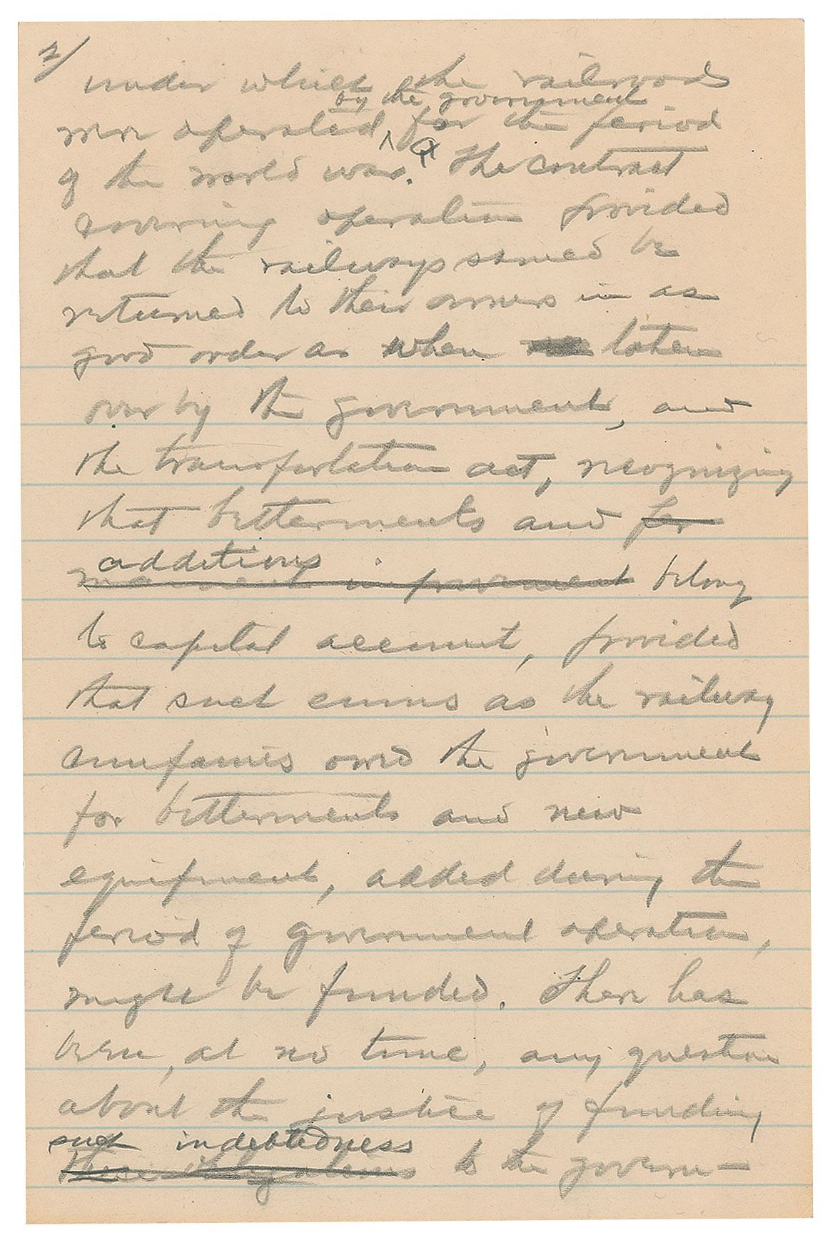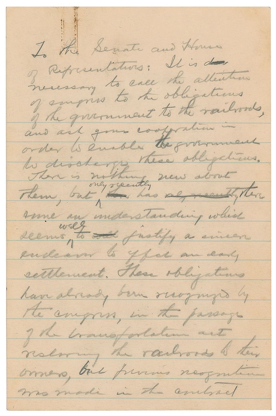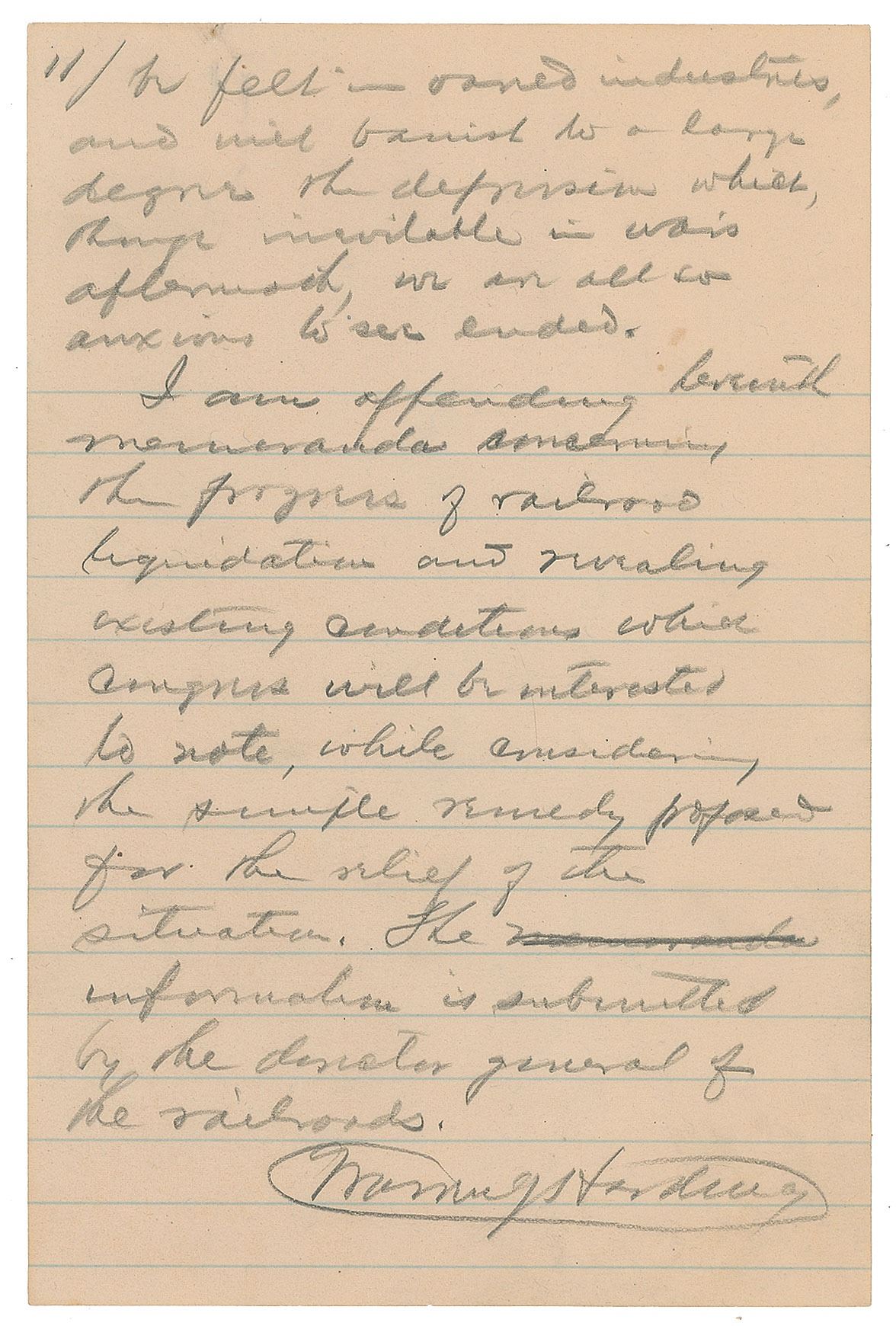 Remarkable AMS in pencil as president, eleven pages, 5.25 x 8, no date but circa July 1921. Harding’s draft for a message to Congress on July 26, 1921, urging the extension of the War Finance Corporation’s powers to provide assistance in the economic crisis afflicting American railroads. In part: “To the Senate and House of Representatives: It is necessary to call the attention of congress to the obligations of the government to the railroads, and ask your cooperation…These obligations have already been recognized by the congress, in the passage of the transportation act restoring the railroads to their owners, but previous negotiations were made in the contract under which the railroads were operated by the government for the period of the world war….The government admittedly owes the railway company large sums on account of under maintenance…The railway administration though possessing assets, does not command the funds necessary to meet what will be its admitted obligations. There is no thought to ask Congress for additional funds. Perhaps $500,000,000 will be necessary. The railroad administration has, or will have…ample securities to meet all requirements, if Congress only will grant the authority to negotiate these securities and provide the agency for their negotiation. With this in view you are asked to extend the authority of the War Finance Corporation so that it may purchase these railway funding securities accepted by the Director General of Railroads. No added expense, no added investment is required on the part of the government; there is no added liability, no added tax burden. It is merely the grant of authority necessary…the avoidance of added appropriation or liability will appeal to Congress and the public alike. The after-war distresses of two great and fundamental activities have been riveting the anxious attention of the country. One is the readjustment and restoration of agriculture, the other is the distress of our railway transportation system…Railway solvency and efficiency are essential to our healthful industrial, commercial and agricultural life. Everything hinges on transportation….The railways need only the financial aid which the fulfillment of our obligations will bestow, to inaugurate their far-reaching revival. Its effects will…banish to a large degree the depression which, though inevitable in war's aftermath, we are all so anxious to see ended.” In fine condition. Handwritten material from Harding’s tenure in the White House is scarce, especially at such great length.