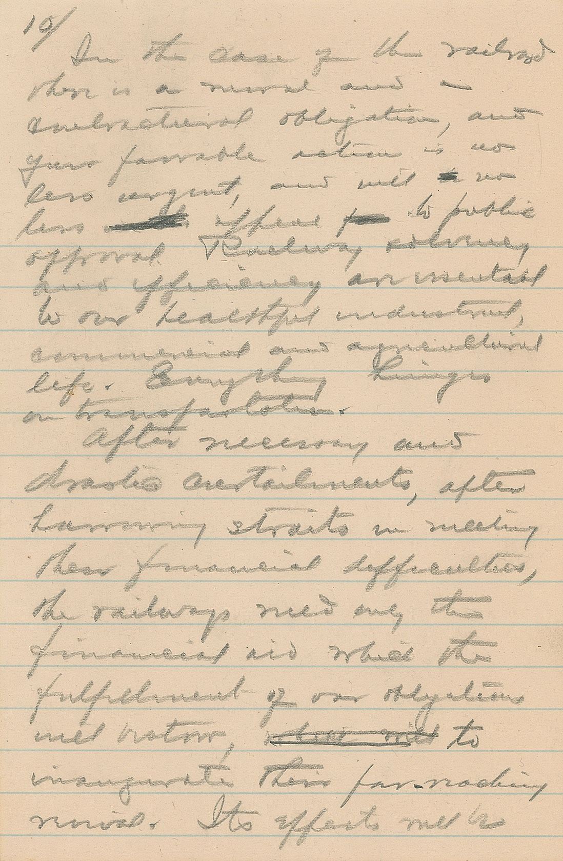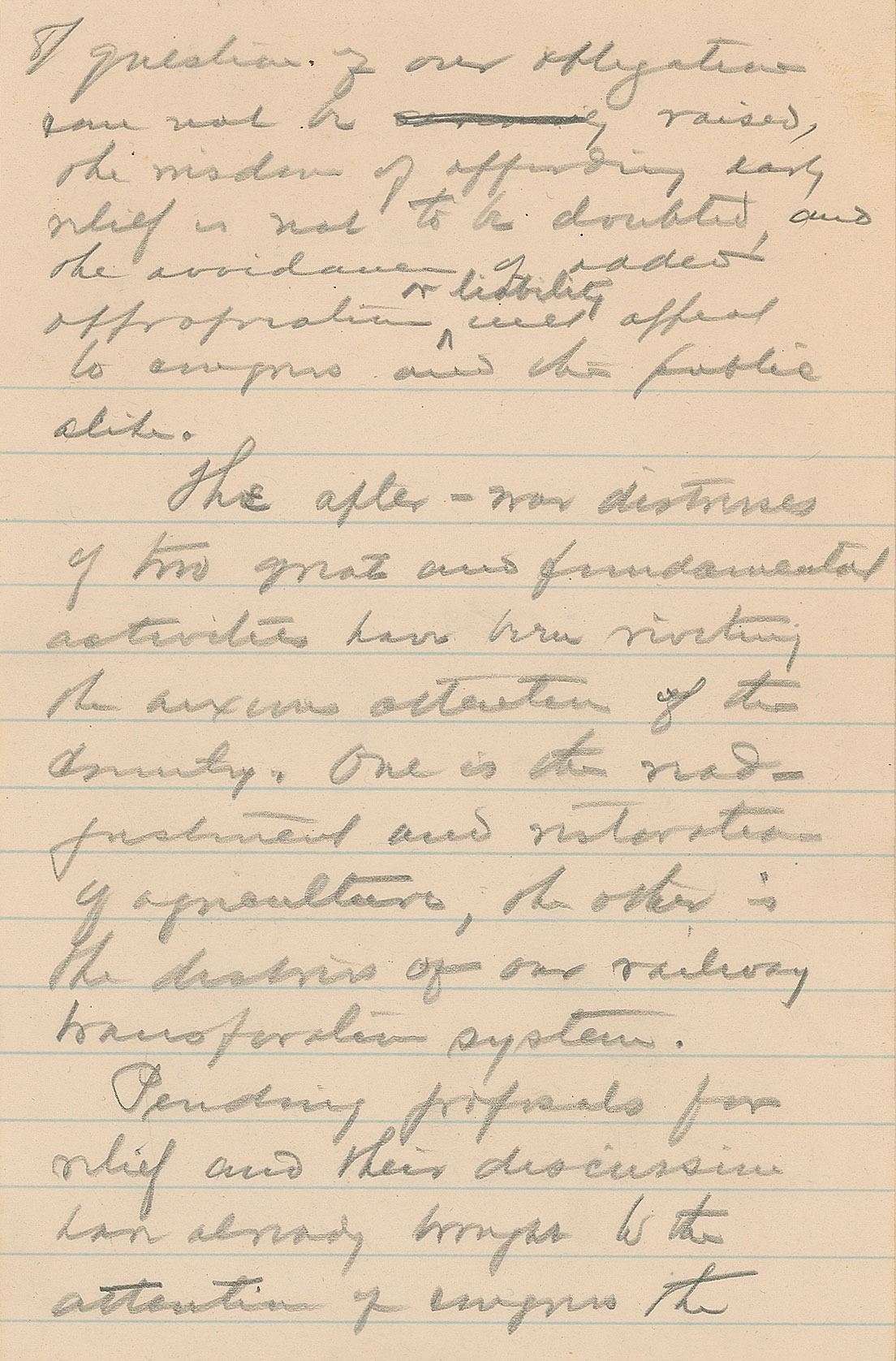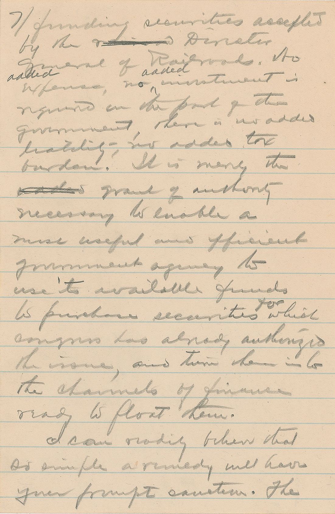 Remarkable AMS in pencil as president, eleven pages, 5.25 x 8, no date but circa July 1921. Harding’s draft for a message to Congress on July 26, 1921, urging the extension of the War Finance Corporation’s powers to provide assistance in the economic crisis afflicting American railroads. In part: “To the Senate and House of Representatives: It is necessary to call the attention of congress to the obligations of the government to the railroads, and ask your cooperation…These obligations have already been recognized by the congress, in the passage of the transportation act restoring the railroads to their owners, but previous negotiations were made in the contract under which the railroads were operated by the government for the period of the world war….The government admittedly owes the railway company large sums on account of under maintenance…The railway administration though possessing assets, does not command the funds necessary to meet what will be its admitted obligations. There is no thought to ask Congress for additional funds. Perhaps $500,000,000 will be necessary. The railroad administration has, or will have…ample securities to meet all requirements, if Congress only will grant the authority to negotiate these securities and provide the agency for their negotiation. With this in view you are asked to extend the authority of the War Finance Corporation so that it may purchase these railway funding securities accepted by the Director General of Railroads. No added expense, no added investment is required on the part of the government; there is no added liability, no added tax burden. It is merely the grant of authority necessary…the avoidance of added appropriation or liability will appeal to Congress and the public alike. The after-war distresses of two great and fundamental activities have been riveting the anxious attention of the country. One is the readjustment and restoration of agriculture, the other is the distress of our railway transportation system…Railway solvency and efficiency are essential to our healthful industrial, commercial and agricultural life. Everything hinges on transportation….The railways need only the financial aid which the fulfillment of our obligations will bestow, to inaugurate their far-reaching revival. Its effects will…banish to a large degree the depression which, though inevitable in war's aftermath, we are all so anxious to see ended.” In fine condition. Handwritten material from Harding’s tenure in the White House is scarce, especially at such great length.