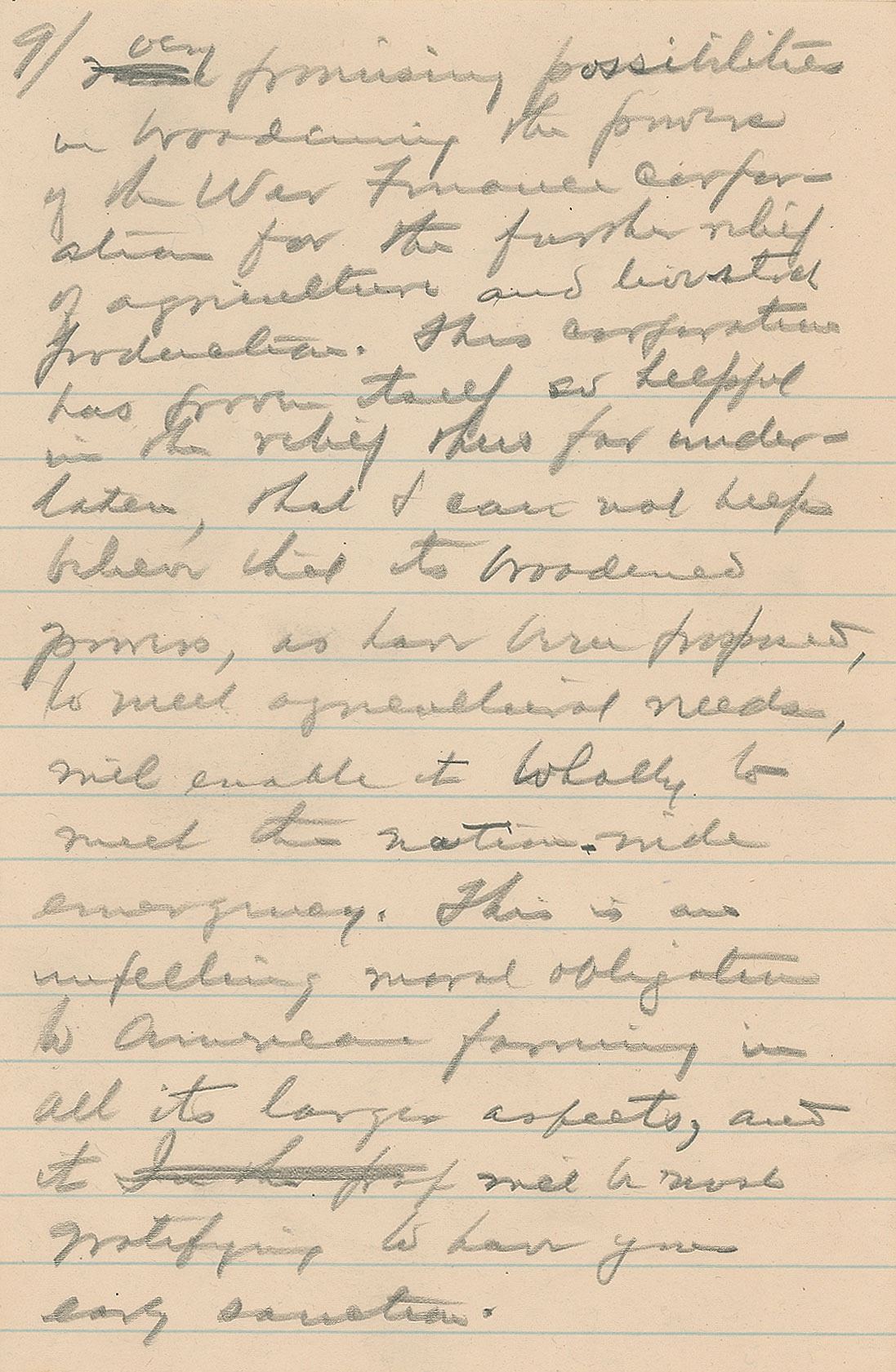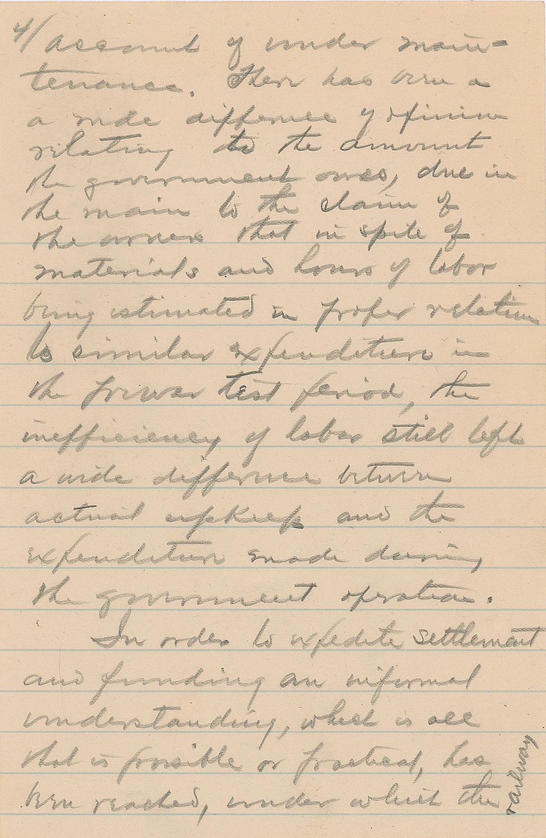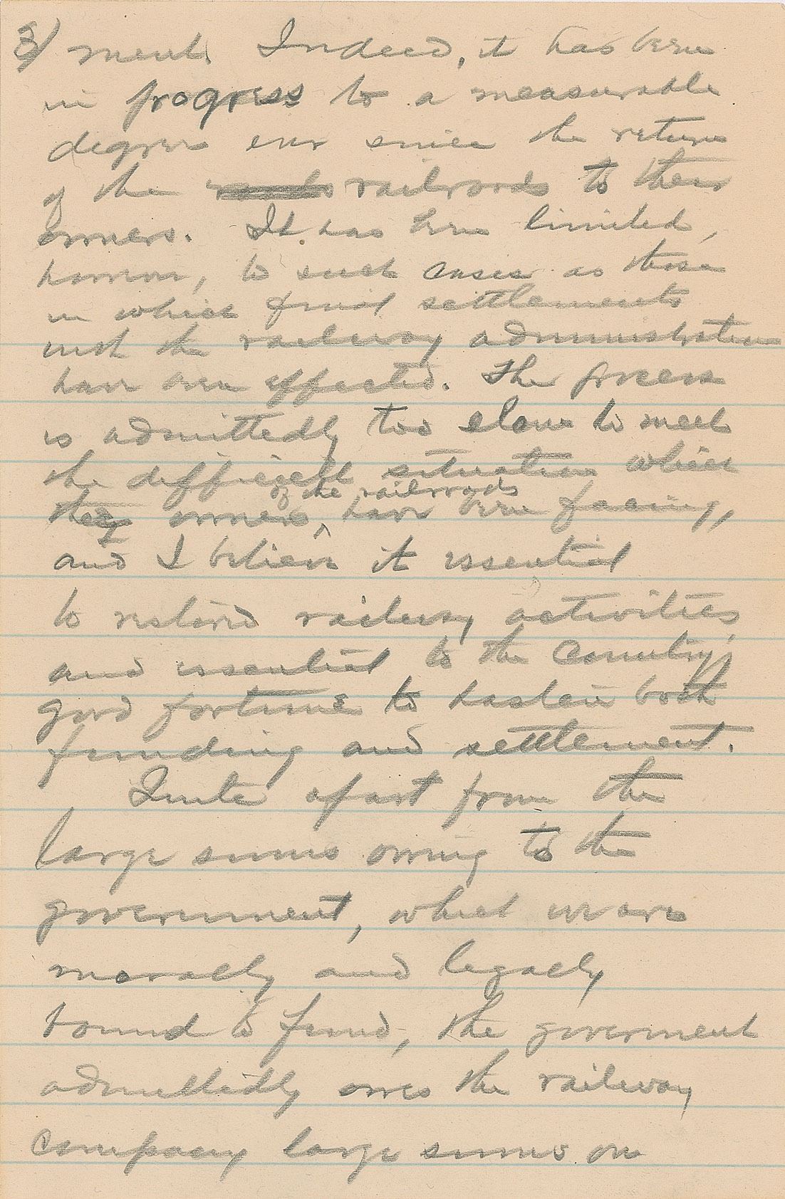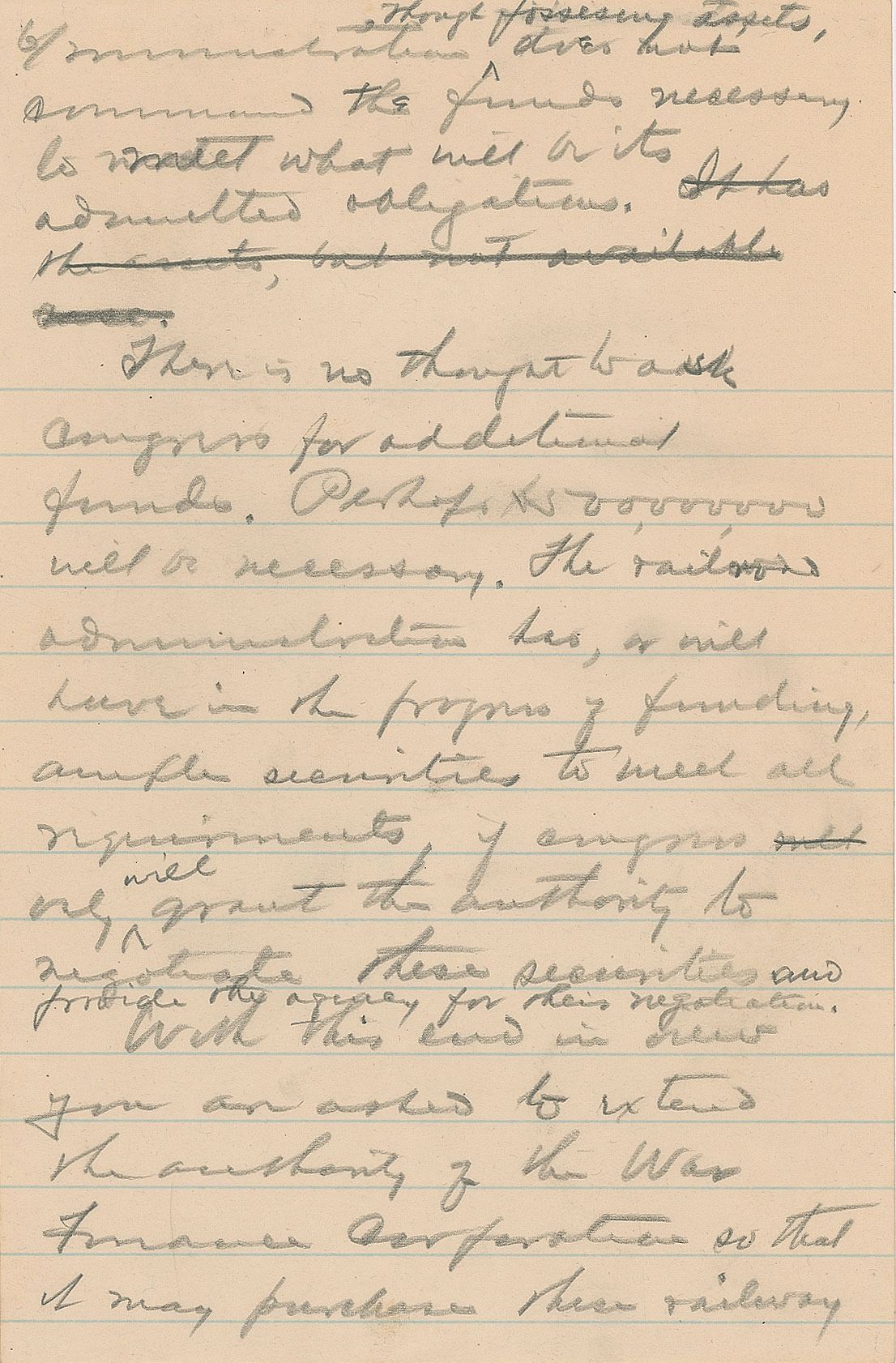 Remarkable AMS in pencil as president, eleven pages, 5.25 x 8, no date but circa July 1921. Harding’s draft for a message to Congress on July 26, 1921, urging the extension of the War Finance Corporation’s powers to provide assistance in the economic crisis afflicting American railroads. In part: “To the Senate and House of Representatives: It is necessary to call the attention of congress to the obligations of the government to the railroads, and ask your cooperation…These obligations have already been recognized by the congress, in the passage of the transportation act restoring the railroads to their owners, but previous negotiations were made in the contract under which the railroads were operated by the government for the period of the world war….The government admittedly owes the railway company large sums on account of under maintenance…The railway administration though possessing assets, does not command the funds necessary to meet what will be its admitted obligations. There is no thought to ask Congress for additional funds. Perhaps $500,000,000 will be necessary. The railroad administration has, or will have…ample securities to meet all requirements, if Congress only will grant the authority to negotiate these securities and provide the agency for their negotiation. With this in view you are asked to extend the authority of the War Finance Corporation so that it may purchase these railway funding securities accepted by the Director General of Railroads. No added expense, no added investment is required on the part of the government; there is no added liability, no added tax burden. It is merely the grant of authority necessary…the avoidance of added appropriation or liability will appeal to Congress and the public alike. The after-war distresses of two great and fundamental activities have been riveting the anxious attention of the country. One is the readjustment and restoration of agriculture, the other is the distress of our railway transportation system…Railway solvency and efficiency are essential to our healthful industrial, commercial and agricultural life. Everything hinges on transportation….The railways need only the financial aid which the fulfillment of our obligations will bestow, to inaugurate their far-reaching revival. Its effects will…banish to a large degree the depression which, though inevitable in war's aftermath, we are all so anxious to see ended.” In fine condition. Handwritten material from Harding’s tenure in the White House is scarce, especially at such great length.