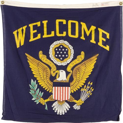 <B>Warren G.Harding Banner and Photograph.</B></I> Welcoming President Harding during his visits around the country, was this colorful 36" x 36" banner. The vintage photo included in this lot shows a similar banner draped on the sidedoor of Harding's car on his visit to Vancouver, British Columbia during his ill-fated western tour in July of 1923. The banner and photograph make an exquisite presentation suitable for framing.