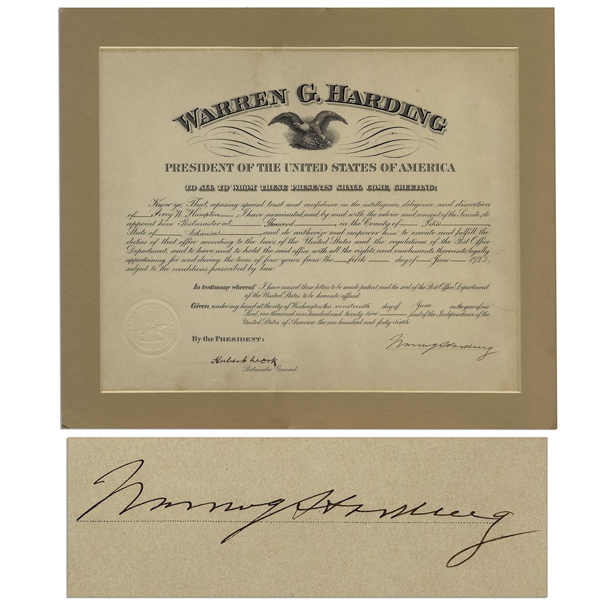Document signed ''Warren G. Harding'' as President. Large partially-printed document is dated 2 June 1922 and appoints one Perry W. Hampton to the position of Postmaster in Pike County, Arkansas. Countersigned by the Postmaster General. Measures 19'' x 16''. Toning, else near fine.