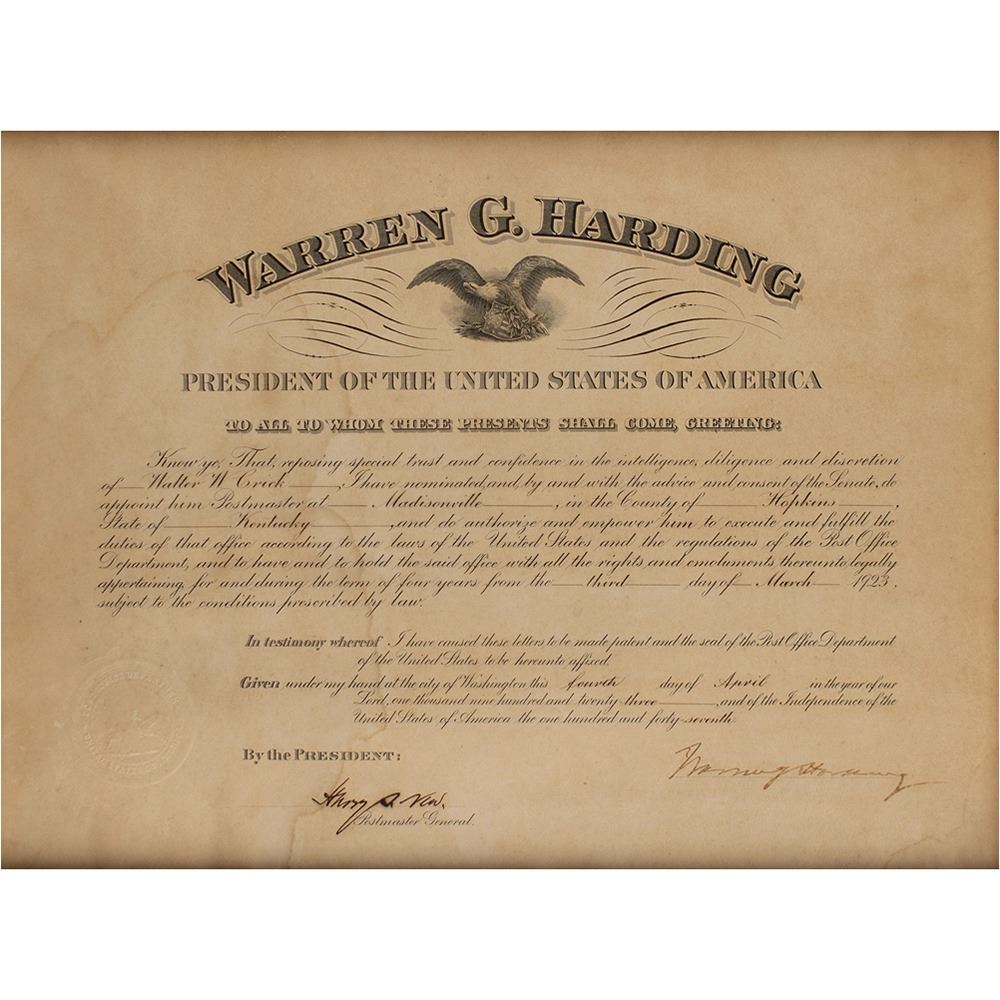 Partly-printed DS as president, one page, 17.5 x 13.5, March 3, 1923. President Harding appoints Walter W. Crick as "Postmaster at Madisonville, in the County of Hopkins, State of Kentucky." Signed at the conclusion by Warren G. Harding, and countersigned by Postmaster General Harry S. New. Lower left corner is embossed with the Post Office Department seal. Archivally framed to an overall size of 21.75 x 17.75. In very good to fine condition, with overall toning, and staining to the left side and to the lower right corner, not affecting the signature.