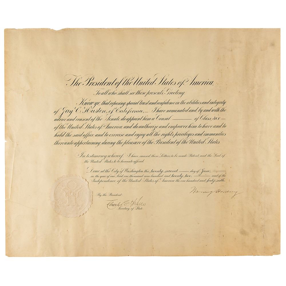 Partly-printed DS as president, one page, 23 x 19, June 2, 1922. President Harding appoints Jay C. Huston of California as "a Consul of Class six of the United States of America." Signed at the conclusion in ink by President Harding and countersigned by Secretary of State Charles Evans Hughes. The embossed paper seal affixed to the lower left remains intact. Tightly rolled and in very good condition, with overall creasing, soiling, and a few edge tears.