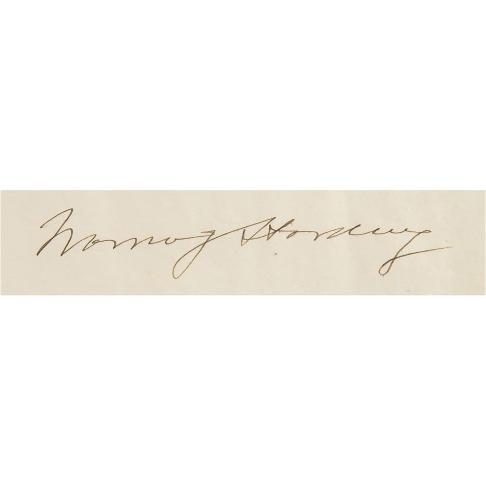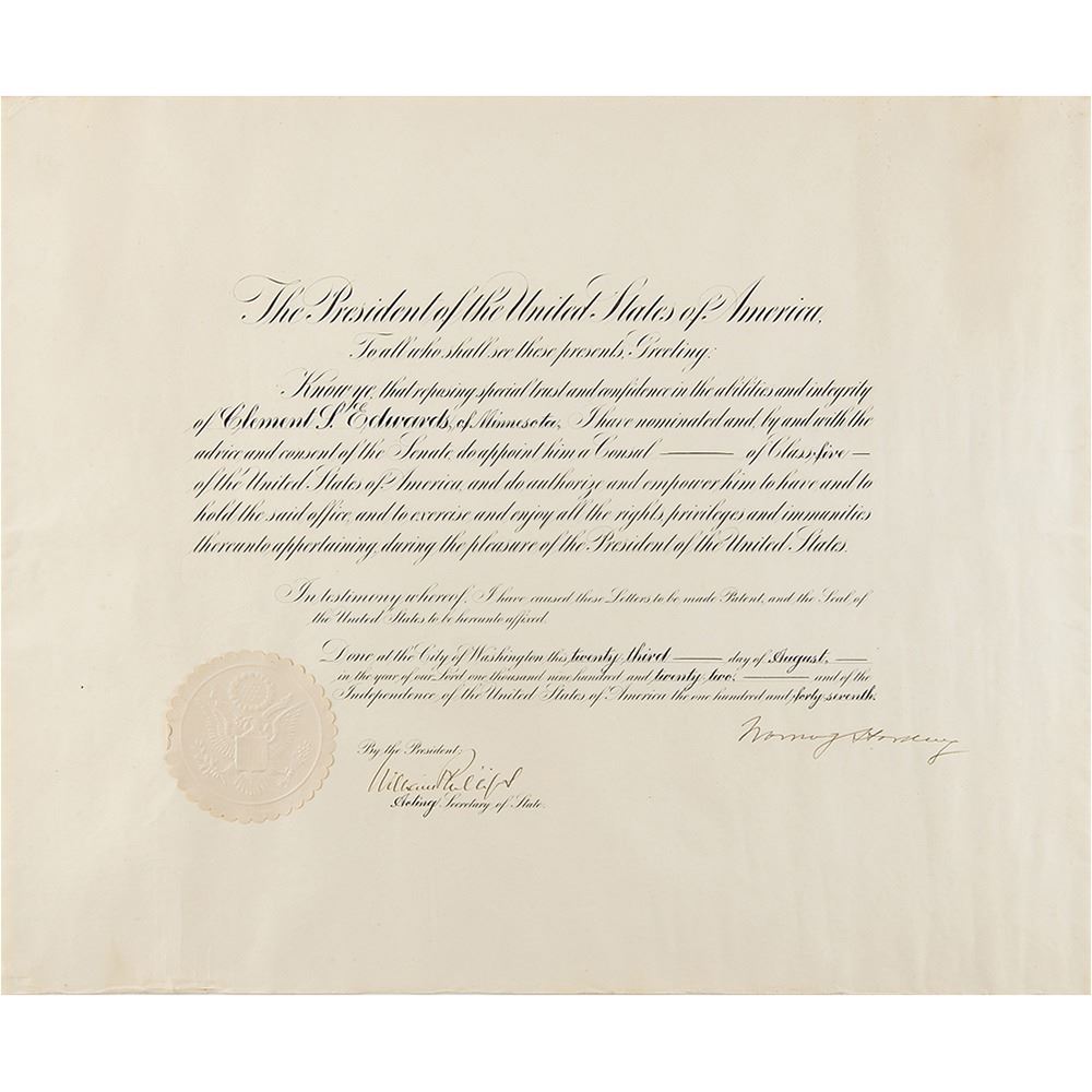 Partly-printed DS as president, one page, 23 x 19, August 23, 1922. President Harding appoints Clement S. Edwards as "a Consul of Class five of the United States of America." Crisply signed at the conclusion by President Warren G. Harding and countersigned by Acting Secretary of State William Phillips. The white paper seal affixed to the lower left remains intact. In fine condition.