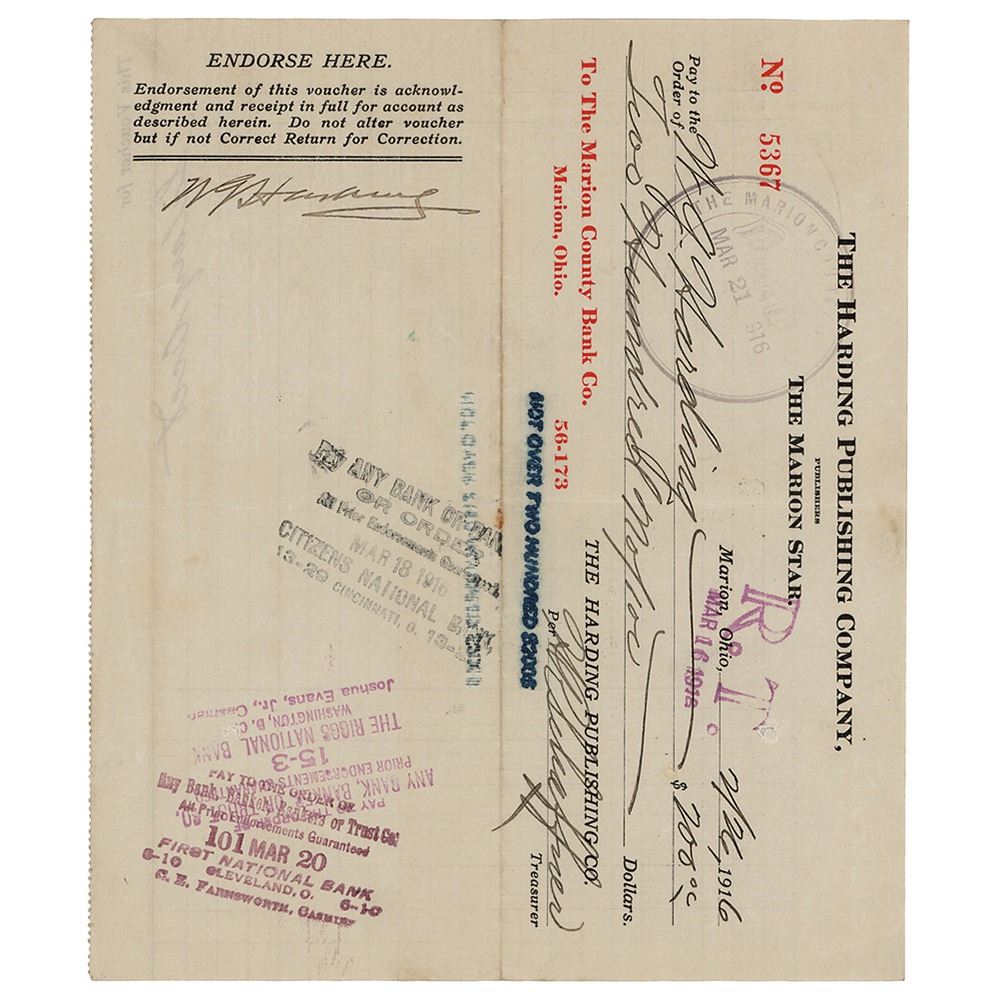 Partly-printed DS, signed “W. G. Harding,” one page, 8.25 x 7, February 26, 1916. Voucher from The Harding Publishing Company (The Marion Star) filled out in another hand and made payable to W. G. Harding for $200, endorsed on the lower panel in ink by Harding. In fine condition.
