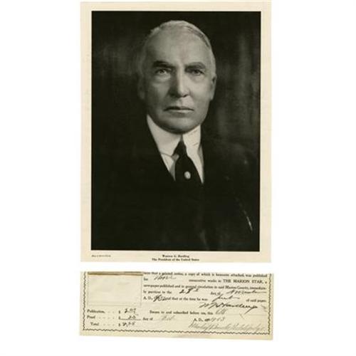 <B>Warren G. Harding Partial Document Signed</B></I> "<I>W. G. Harding</B></I>". 7.75" x 2.75", February 6, 1903, with notary seal in blind, a printed proof of publication for a notice which ran for three weeks in Harding's newspaper <I>The Marion Star.</B></I> Before Harding's rise to president of the United States he enjoyed a successful newspaper career. He took the ailing <I>Marion Star</B></I> and brought the paper back to profitability. This is a bold and bright Harding signature in very good condition. Comes with a 7.75” x 10.5” portrait of Harding clipped from a souvenir program of the Conference on Limitation of Armament, in very good condition. <I>Ex. Henry E. Luhrs Collection</B></I>.<BR><BR><BR><b>Shipping:</b> Flat Material, Small (<a target="_blank" href="http://www.heritageauctions.com/common/shipping.php">view shipping information</a>)