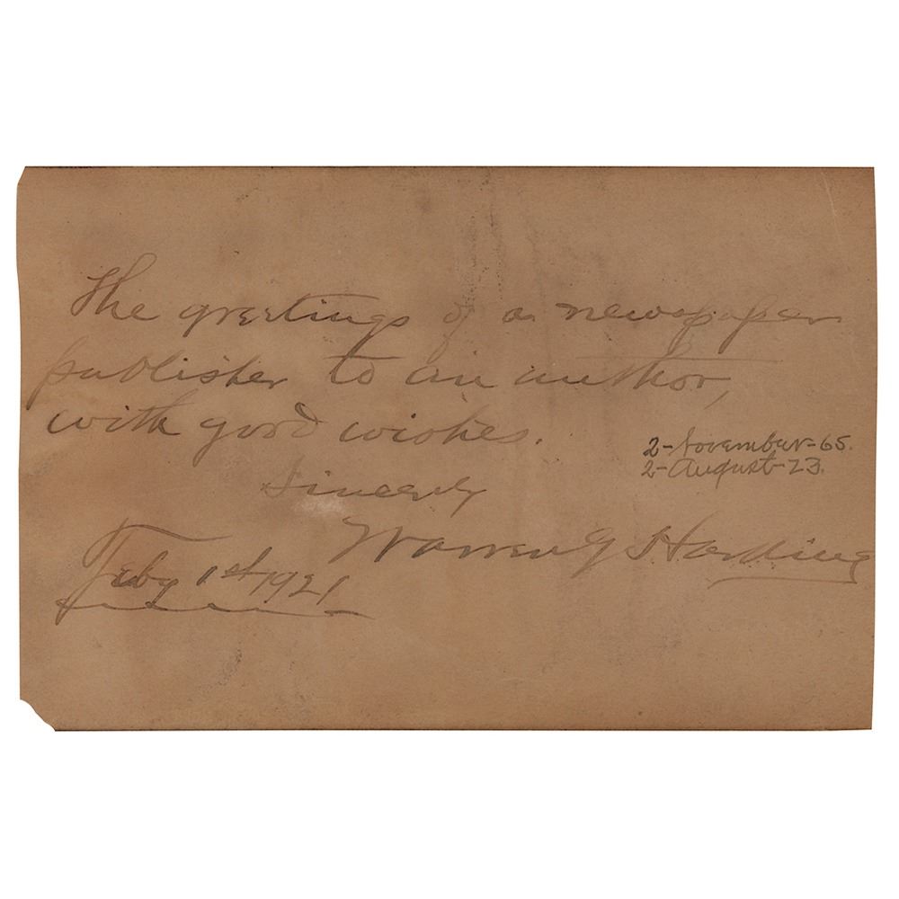 Ink signature and inscription as president elect, "The greetings of a newspaper publisher to an author, with good wishes, Sincerely, Warren G. Harding, Feby 1st 1921," on an off-white 6 x 4 sheet. In very good to fine condition, with soiling, light staining, and trimmed side edges. An atypically lengthy handwritten inscription from Harding, penned a month before his transition from "newspaper publisher" to American president.