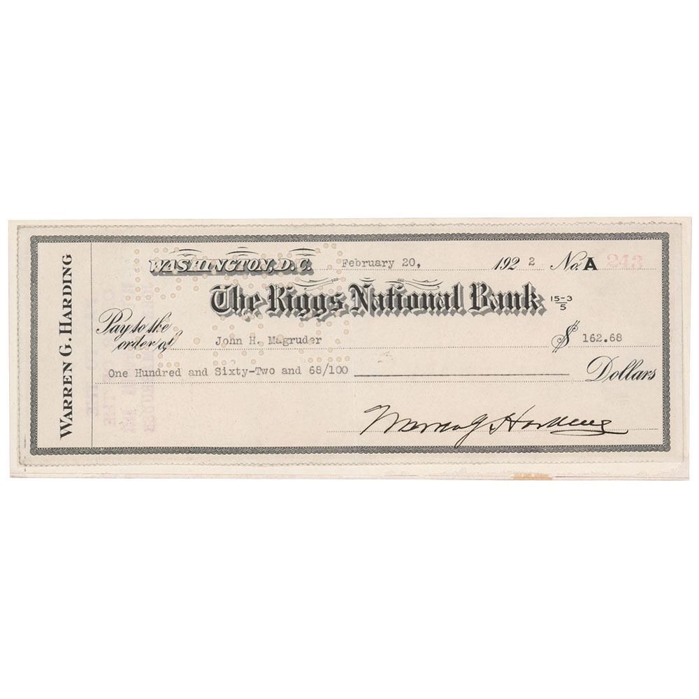 Rare personal check, 8.25 x 3, filled out in type and signed as president by Warren G. Harding, payable to John H. Magruder for $162.68, February 20, 1922. Affixed to a slightly larger cardstock mount and in fine condition. A scarce signed check from President Harding, one of only a few we have ever offered.