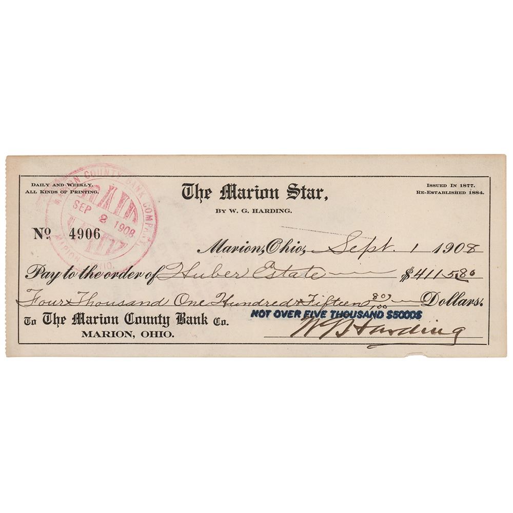 The Marion Star business check, 8 x 3.25, filled out in another hand and signed by Harding, "W. G. Harding," payable to the Huber Estate for $4115.80, September 1, 1908. In fine condition.