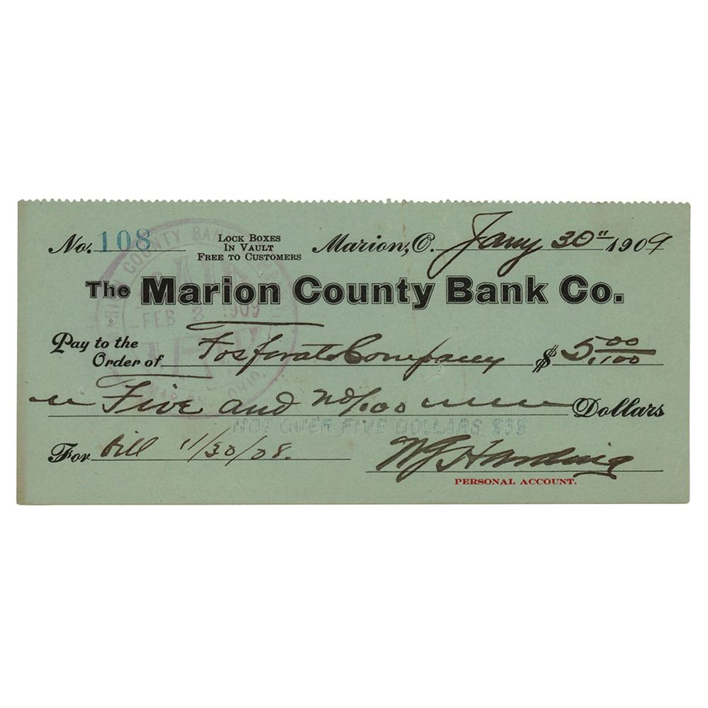 Marion County Bank check, 6 x 2.75, filled out and signed by Harding, "W. G. Harding," payable to Fosforat Company for $5, January 30, 1909. In fine condition.
