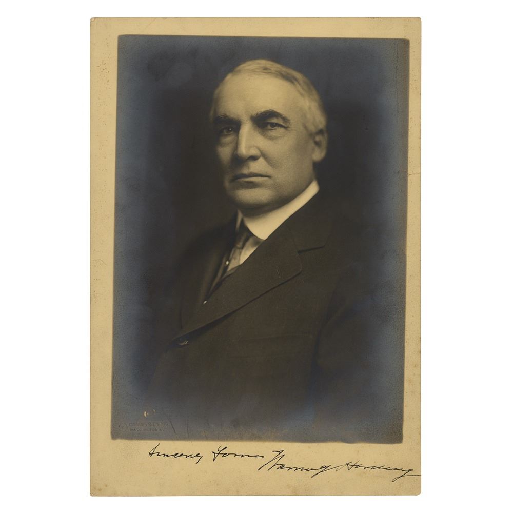 Vintage matte-finish 7.5 x 10.75 Harris & Ewing portrait photo of President Harding, signed in the lower border in black ink, "Sincerely yours, Warren G. Harding." The lower left corner bears the Harris & Ewing studio blindstamp. Collector's notation to reverse dates the autograph to January 25, 1923, late in Harding's administration and six months before his death. In very good to fine condition, with two short edge tears, and heavy silvering to the perimeter of the image.