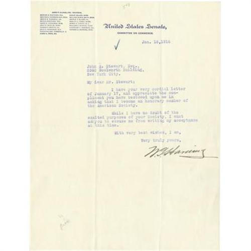 <B>Warren G. Harding Typed Letter Signed,</B></I> "<I>W.G. Harding</B></I>", one page on U.S. Senate, Committee on Commerce letterhead, 8" x 10.5", Washington, D.C., January 18, 1916, to John A. Stewart, New York City. The letter reads, "<I>I have your very cordial letter of January 17, and appreciate the compliment you have bestowed upon me in asking that I become an honorary member of the American Society. While I have no doubt about the exalted purposes of your Society, I must ask you to excuse me from writing my acceptance at this time.</B></I>" Very fine condition. This letter was written while the nation's future 29th president was serving as a U.S. Senator from Ohio. <I>From the collection of Henry E. Luhrs.</B></I><BR><BR><b>Shipping:</b> Flat Material, Small (<a target="_blank" href="http://www.heritageauctions.com/common/shipping.php">view shipping information</a>)