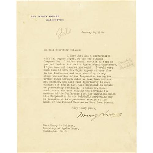 <B>Warren G. Harding Typed Letter Signed</B></I> 7” x 8.75”, White House stationary, four pages with cojoined sheets penned on first page, January 9, 1922, Washington. Written to Secretary of Agriculture Henry C. Wallace. Near fine.<BR><BR><BR><b>Shipping:</b> Flat Material, Small (<a target="_blank" href="http://www.heritageauctions.com/common/shipping.php">view shipping information</a>)