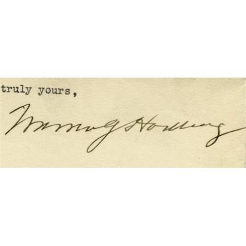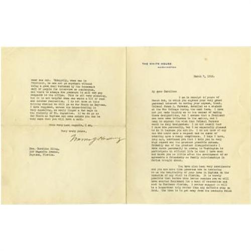 <B>Warren G. Harding Typed Letter Signed</B></I> “<I>Warren G. Harding</B></I>” as President, two pages, 7” x 9” conjoined sheets, typed on first and fourth pages. The White House, March 7, 1922. To Mrs. Caroline Kling, Daytona, Florida. In part, “<I>I am in receipt of yours of March 3rd, in which you express your very great personal interest in having your nephew, Lieut. Colonel James K. Parsons, detailed as a student at the War College during the next term. I have not yet made inquiry as to the manner of making these designations, but I assume that a President can have some influence in the matter, and I mean to express the wish that Colonel Parsons shall be duly designated…Probably one of the greatest disappointments I have known personally in coming to Washington to participate in official life is that I have seen and known you so little after the development of so agreeable a friendship as family relationships in Marion brought about. You have also been very considerate and you are more than generous now in tendering to us the hospitality of your home in Daytona on the occasion of any visit to Florida…I rather suspect it will be a house-boat trip…Unhappily, when one is President, he can not go anywhere without being a good deal burdened by the incessant call of people for interview or conference, and there is always the pressure to call and pay respects to the office. This is all very pleasing, but it is not helpful when one wants a bit of rest and outdoor recreation…If we do go so far South as Daytona and come ashore you can be very sure that you will have a call.</B></I>” The next day, President and Mrs. Harding left Washington for St. Augustine, Florida, by train, then embarked down the coast on the houseboat <I>Pioneer</B></I> owned by <I>Washington Post</B></I> publisher Edward B. McLean. He did get to Daytona before returning to Washington. The Annual Report of the Director of The General Staff School for 1922-1923 shows that among the 111 officers who attended the Command and General Staff School at Ft. Leavenworth, Kansas, for the year and graduated was “Lieutenant Colonel James K. Parsons, Infantry,” so the President was successful in granting Mrs. Kling's wish. The next school they would attend would be the War College. General Staff School graduates who went on to the War College include Generals Eisenhower, Bradley, and Patton. Mrs. Caroline Kling was definitely a relative of the President's wife whose maiden name was Kling, for Harding mentions in this letter that after he moved from Marion, Ohio, to Washington (when he became U.S. Senator in 1915), he had hardly seen her “<I>after the development of so agreeable a friendship as family relationships in Marion.</B></I>” A marvelous Harding presidential letter in which he writes of the advantages and disadvantages of being President. Fine condition. <I>Ex. Henry E. Luhrs Collection.</B></I><BR><BR><BR><b>Shipping:</b> Flat Material, Small (<a target="_blank" href="http://www.heritageauctions.com/common/shipping.php">view shipping information</a>)