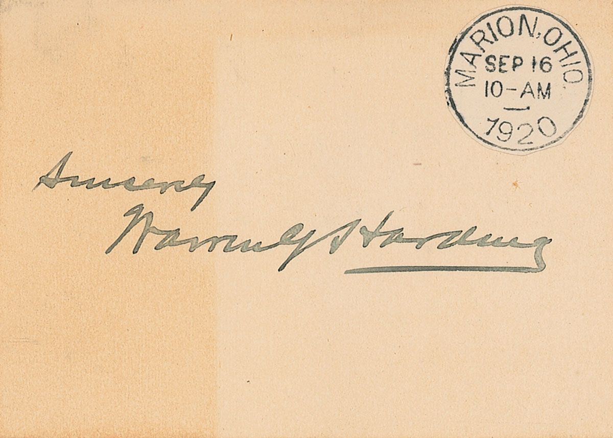 Ink signature, “Sincerely, Warren G. Harding,” on an off-white 3.5 x 2.5 card bearing a clipped September 16, 1920, postmark affixed to the upper right. In very good to fine condition, with a block of toning to the left side, a couple light creases and slight rippling to edges, and mounting remnants to reverse. Accompanied by 12 slips and cards, each signed by a member of his cabinet. Signers are: Calvin Coolidge, Herbert Hoover, Charles Evans Hughes, Andrew W. Mellon, Henry C. Wallace, Albert B. Fall, John W. Weeks, Harry M. Daugherty, James J. Davis, Edwin Denby, William H. Hays, and Hubert Work. In overall very good to fine condition, with various toning and rippling.