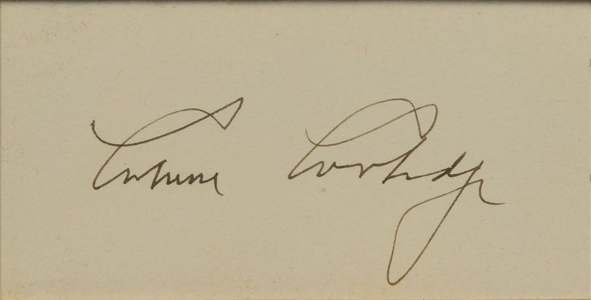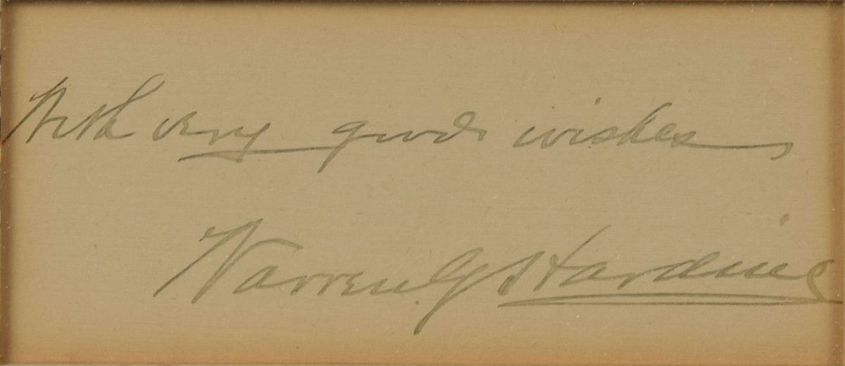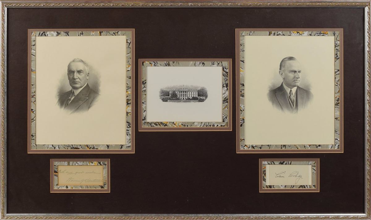 Ink signatures, "With my good wishes, Warren G. Harding" and "Calvin Coolidge," on individual off-white slips, triple-matted and framed with three engraved portraits to an overall size of 32 x 19. In fine condition, with light toning to the Harding card.