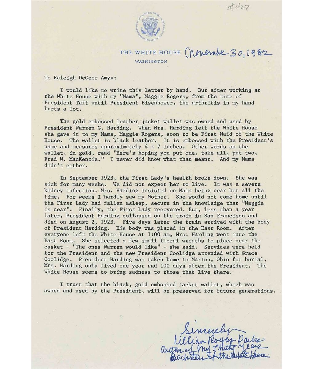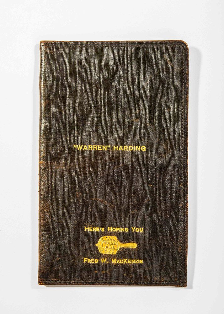 President Harding’s personally-owned and -used leather jacket pocket wallet. Black leather wallet measures 4 x 7, and is handsomely embossed in gold on one side, “‘Warren’ Harding,” with “Here’s hoping you put on, take all, put two, Fred W. MacKenzie,” embossed along the bottom. Accompanied by a detailed 1982 letter of provenance, on White House letterhead, by Lillian Rogers Parks, who was a best selling author as well as housekeeper and seamstress at the White House for over 30 years, from President Hoover through President Eisenhower. Letter reads, in part: “The gold embossed leather jacket wallet was owned and used by President Warren G. Harding. When Mrs. Harding left the White House, she gave it to my Mama, Maggie Rogers, soon to be First Maid of the White House.” In fine condition. Seldom is a president’s personal wallet offered, especially in such splendid condition.