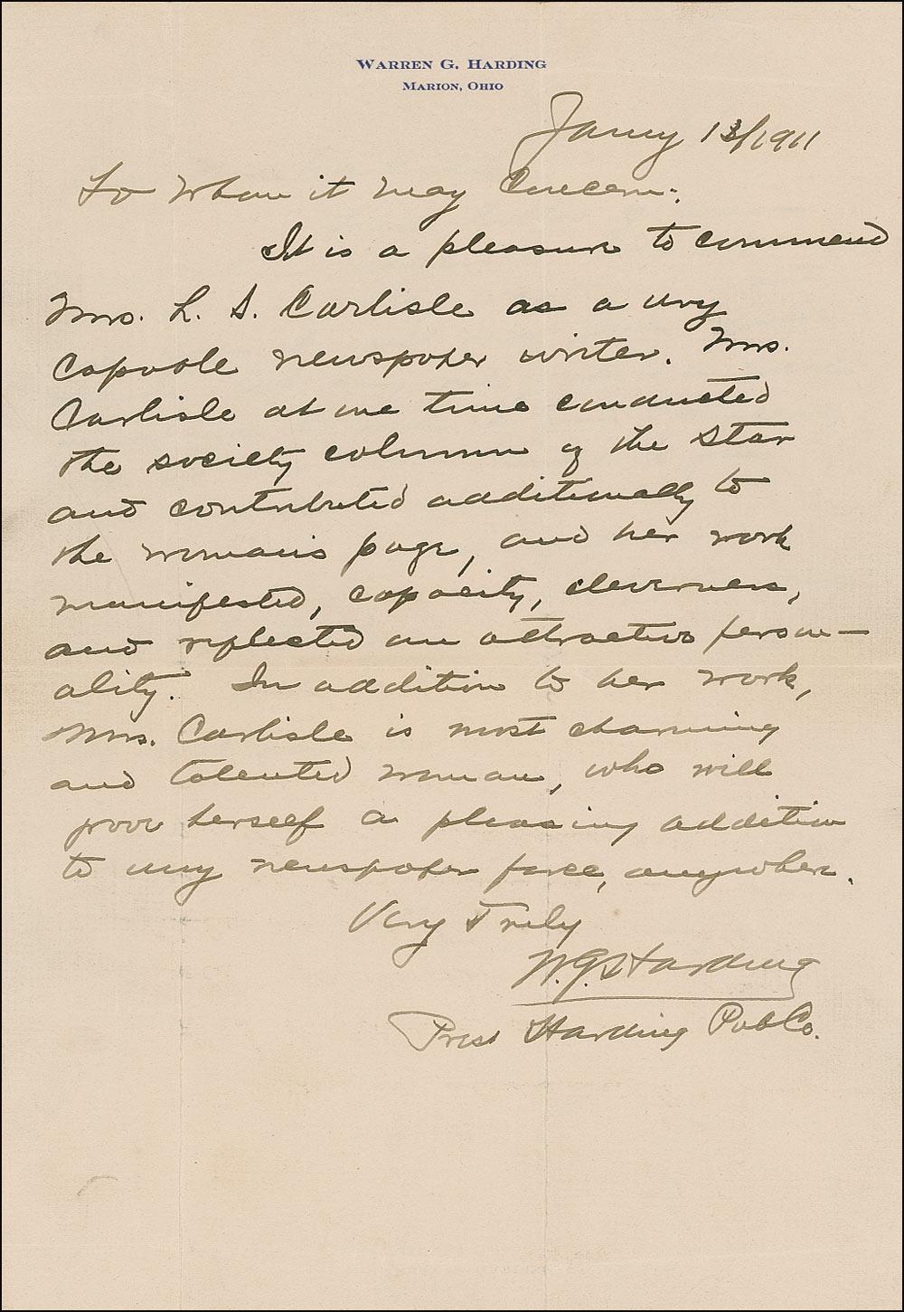 Two ALSs, both dated January 13, 1911, on his personal letterhead. First letter, signed “W. G. Harding,” is to Mrs. L. S. Carlisle forwarding a letter of recommendation. In full: ”Find letter of recommendation enclosed. I do not know that it is exactly what you want, but hope it will meet your requirements. At any note, it is a great pleasure to write it, and I sincerely hope it will prove useful to you.” The second letter, the actual letter of recommendation, signed “W. G. Harding, Pres. Harding Publishing Co.,” reads, in part: “It is a pleasure to commend Mrs. L. S. Carlisle as a very capable newspaper writer.” In very good condition, with intersecting folds and scattered toning. Harding is surprisingly scarce in handwritten letters.