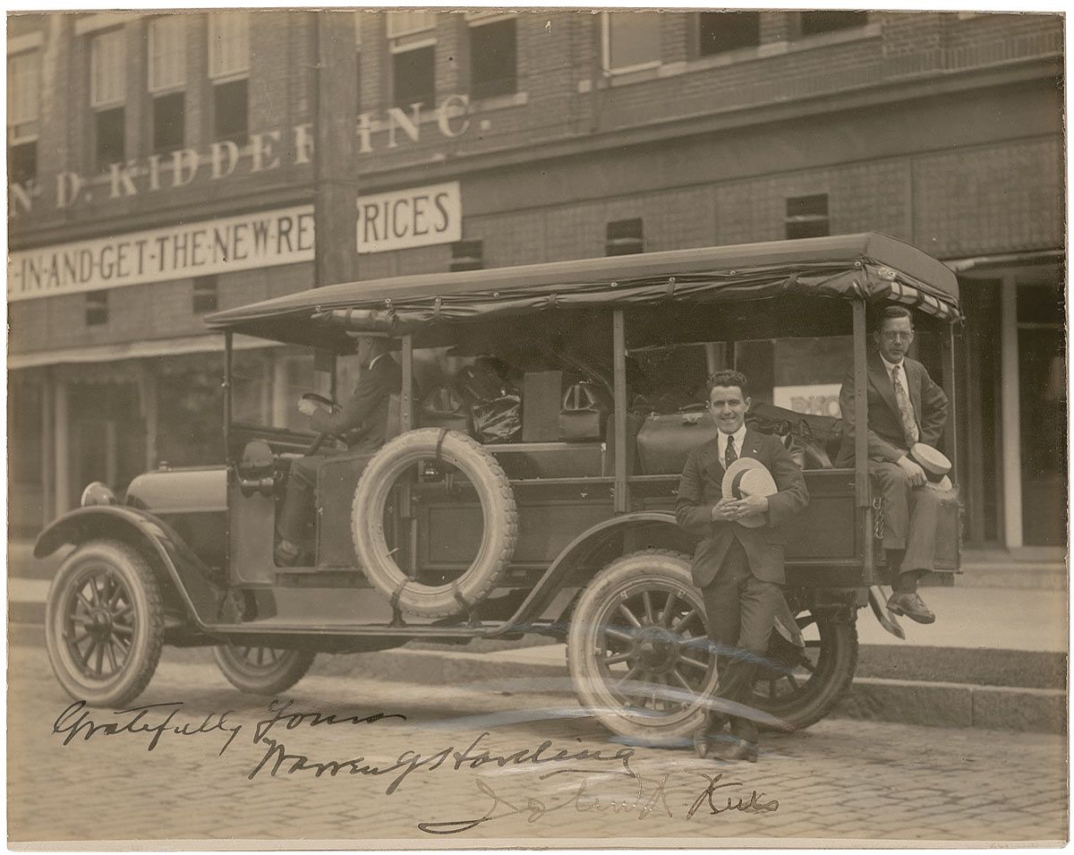 Vintage glossy 9.75 x 7.75 photo of a vehicle, with luggage in the rear, in front of Myron D. Kidder, Inc., distributor of cars and trucks, in Portland, Maine, with four men in or around the vehicle, signed in fountain pen as President, “Gratefully yours, Warren G. Harding,” and also signed by “Secretary of War John W. Weeks.” Photo is affixed by its bottom edge to an identical size piece of heavy cardstock. In very good condition, with mild overall rippling, lightly trimmed edges, a few surface marks and creases, and Weeks’s signature light, but legible. In August 1921, President Harding was invited by his Secretary of War John W. Weeks to spend a few days at his summer home in Lancaster, New Hampshire. On August 2, 1921, the presidential yacht Mayflower arrived at Portland, Maine, at 9:30 A.M. After a short speech from the steps of the Portland Municipal Building, President Harding departed by automobile for Lancaster at 11 A.M. This is undoubtedly a photograph of the vehicle carrying President Harding’s luggage to Lancaster.